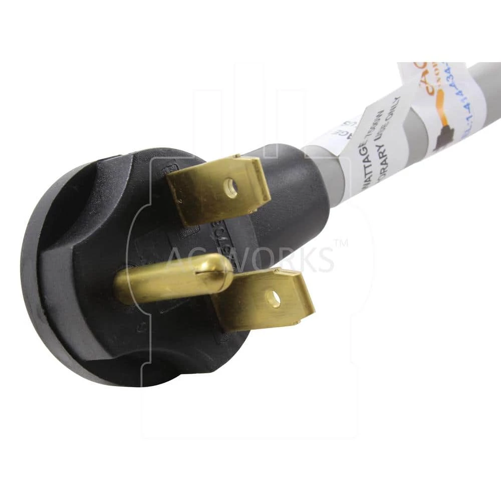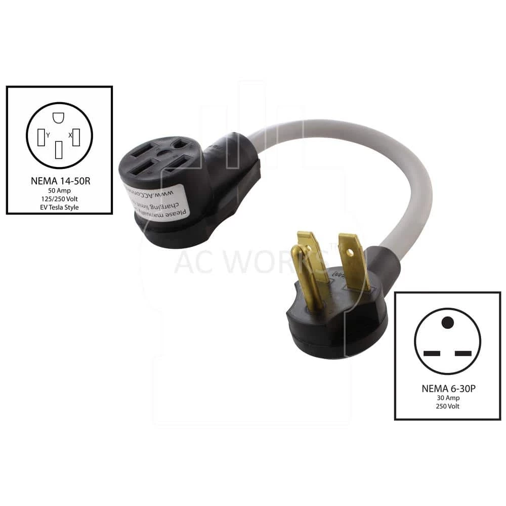This AC WORKS brand EV charging adapter cord [EV630MS-018] is very durable. This adapter is 1.5 feet in length and is a NEMA 6-30P to NEMA 14-50R. The NEMA 6-30P is a 30 Amp, 250-Volt, 3-prong straight-blade male plug. The NEMA 14-50R is a 50 Amp 125/250-Volt, 4-prong straight-blade female connector. The cable is STW, 10/3 heavy-duty 600-Volt jacket. Included with your purchase is a 5-year limited warranty.