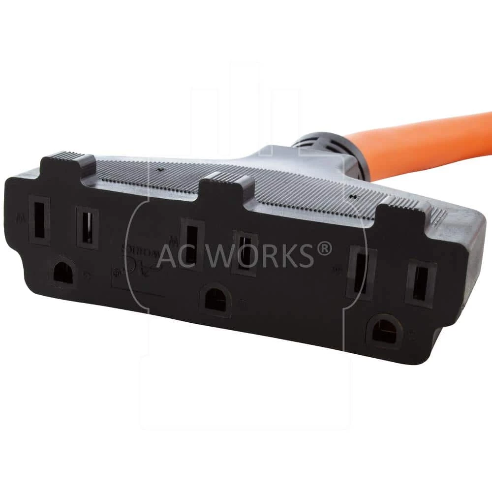 This AC WORKS brand Power Distribution Cord [L530W515] is a durable Power Cord. The cord is a NEMA L5-30P to (3) NEMA 5-15R outlets. The NEMA L5-30P is a 30 Amp, 125 Volt 3-Prong locking plug. The NEMA 5-15R is a 15 Amp regular household female connector. The connector end is a straight-blade household style. The cable is a STW, 10/3, anti-cold weather cord staying flexible in extreme temperatures. Included with your purchase is a 5-year limited warranty.