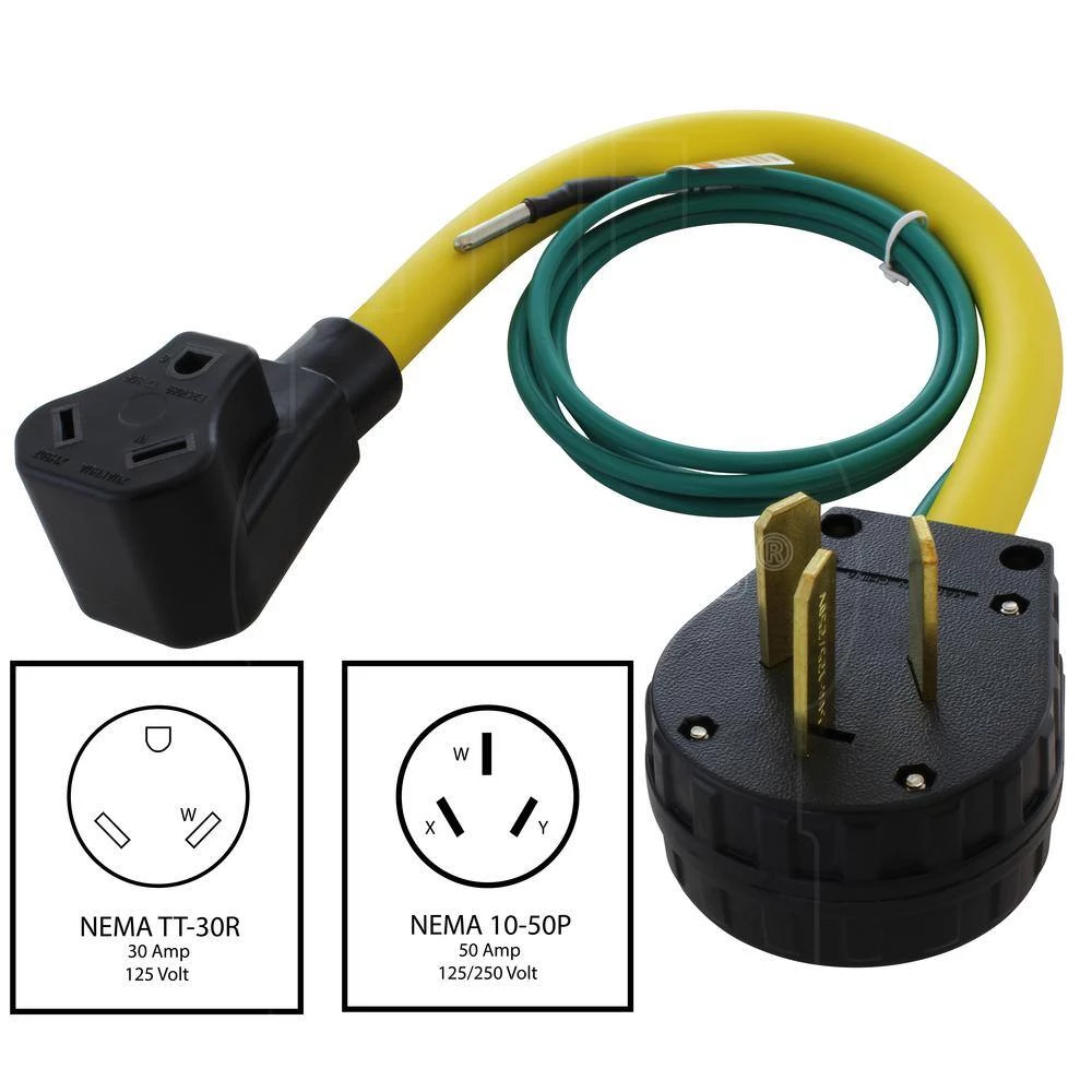 This AC WORKS brand RV adapter is 1.5 ft. in L and is a NEMA 10-50P to NEMA TT-30R. The NEMA 10-50P is a 50 Amp, 125/250-Volt 3-prong old welder/range male plug. The NEMA TT-30R is an RV 30 Amp, 125- Volt female connector. This adapter has a maximum operating power of 3750-Watt and is backed by a 5-year limited warranty.