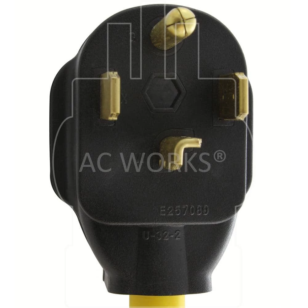 This AC WORKS brand RV adapter [RV1430TT-018] is 1.5-feet in length and is a NEMA 14-30P to NEMA TT-30R. The NEMA 14-30P is a 30 Amp, 125/250 Volt 4-prong dryer male plug. The NEMA TT-30R is a RV 30 Amp, 125 Volt female connector. This adapter has a maximum operating power of 3750 Watts and is backed by a 5-year limited warranty.