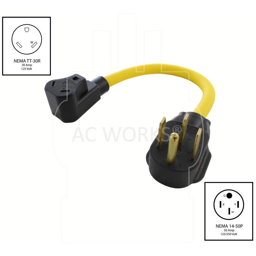 This AC WORKS brand RV adapter [RV1450TT-018] is 1.5-feet in length and is a NEMA 14-50P to NEMA TT-30R. The NEMA 14-50P is a 50 Amp, 125/250 Volt 4-Prong RV/ Generator/ Range male plug. The NEMA TT-30R is an RV 30 Amp, 125 Volt female connector. This adapter has a maximum operating power of 3750 Watts and is backed by a 5-year limited warranty.