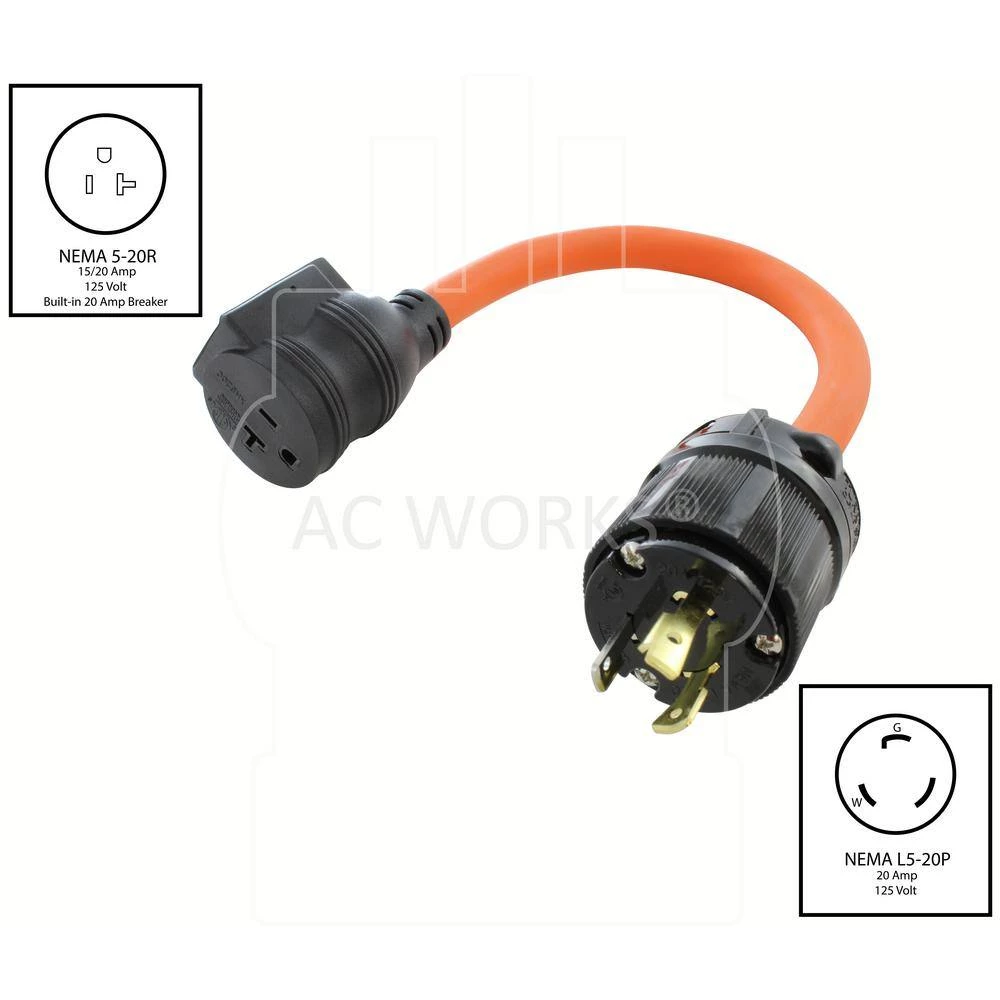 This AC WORKS brand adapter cord [L520CB520] is a heavy-duty household adapter cable. This 1.5-foot cord is a NEMA L5-20P to NEMA 5-15/20R. The NEMA L5-20P is a 20 Amp, 125 Volt locking male plug. The NEMA 5-15/20R is a 15/20 Amp, T-blade female connector. The cable is an STW, 10/3, anti-cold weather cable staying flexible in extreme temperatures. The cord is super durable and typically used in construction and industrial equipment. Included with your purchase is a 5-year limited warranty.