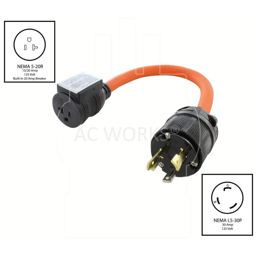 This AC WORKS brand Adapter cord [L530CB520-018] is a heavy-duty household adapter cable. This 1.5-foot cord is a NEMA L5-30P to NEMA 5-15/20R. The NEMA L5-30P is a 30 Amp, 125 Volt locking male plug. The NEMA 5-15/20R is a 15/20 Amp, T-blade female connector. The cable is an STW, 10/3, anti-cold weather cable staying flexible in extreme temperatures. The cord is super durable and typically used in Marine Shore Dock, Generator, Construction and Industrial equipment. Included with your purchase is a 5-year limited warranty.