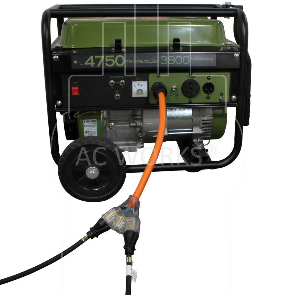 This AC WORKS brand locking power strip cord [L1430W620-018] is 1.5 ft. long with a NEMA L14-30P 30 Amp 125/250-Volt locking plug to (3) NEMA 6-15/20R 20 Amp T-blade female connectors. The strip of outlets has built-in power indicator lights. The cable is an STW 10/3 30 Amp copper wire with 600-Volt anti-cold weather jacket. Included with your purchase is a 5-year limited warranty.