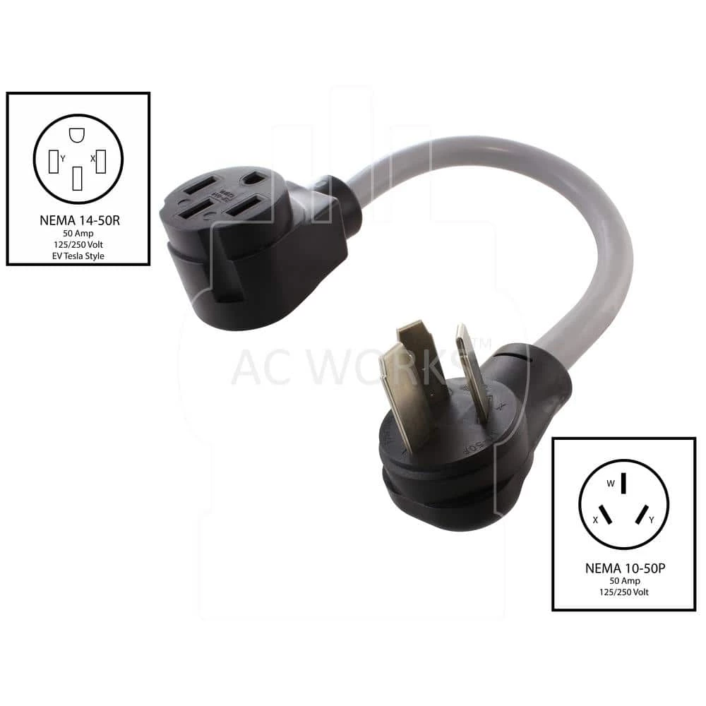 This AC WORKS brand EVSE charging adapter is made of very durable construction. It is a NEMA 10-50P to NEMA 14-50R. The NEMA 10-50P is a 50 Amp, 125/250-Volt Dryer/Welder plug. The NEMA 14-50R is a 50 Amp, 125/250-Volt EV Tesla female connector. The NEMA 10-50P gets power from a NEMA 10-50R dryer or welder socket to charge a Tesla vehicle. It has 6/2+8/1 50Amp copper wire with 300-Volt jacket. This adapter works for Tesla vehicles only. This product includes a 5-year limited warranty.