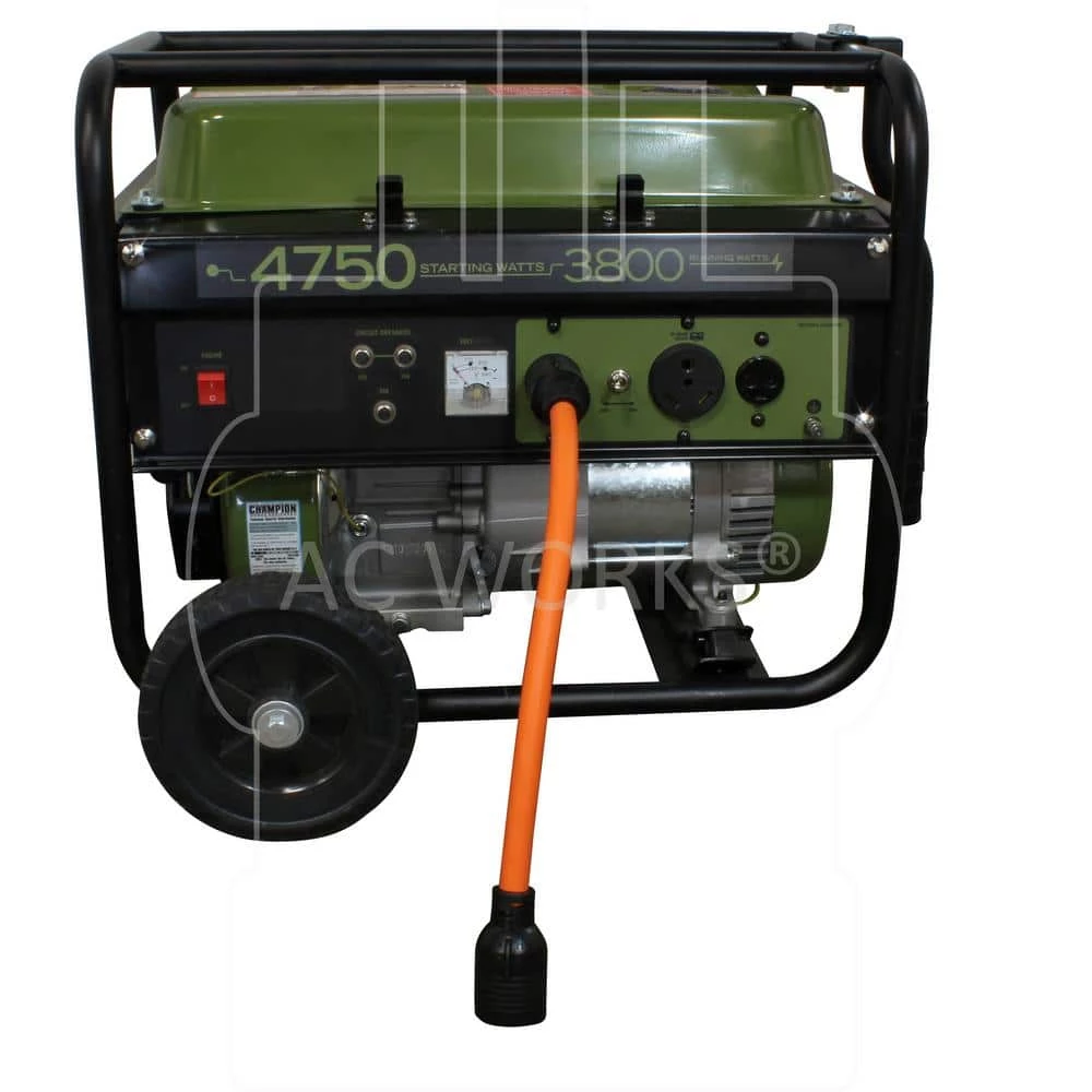 This AC WORKS brand adapter cord [L1430L630-018] is very durable. It is a NEMA L14-30P to NEMA L6-30R. The NEMA L14-30P is a 30 Amp, 125/250-Volt, 4-prong locking male plug. The NEMA L6-30R is a 30 Amp, 250-Volt, 3-prong locking female connector. This adapter is 1.5 ft. in length and is an STW, 10/3, anti-cold weather cable staying flexible in the extreme temperatures. Included with your purchase is a 5-year limited warranty.