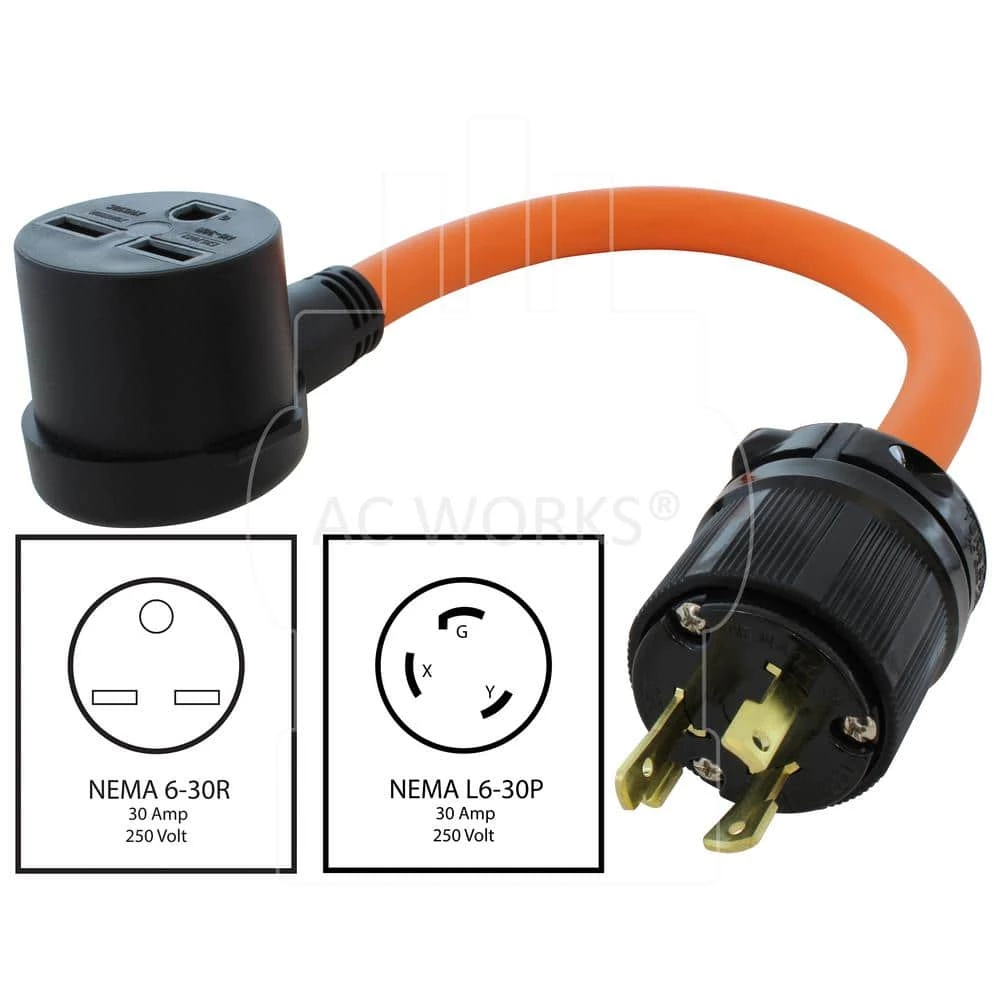 This AC WORKS brand adapter [L630630-018] is very durable with a flexible design. It is a NEMA L6-30P to NEMA 6-30R. The NEMA L6-30P is a 30 Amp, 250-Volt, 3-prong male plug. The NEMA 6-30R is a 30 Amp, 250-Volt, 3-prong HVAC female connector. The product is heavy-duty STW 10/3 30 Amp copper wire with 600-Volt jacket. Included with your purchase is a 5-year limited warranty.