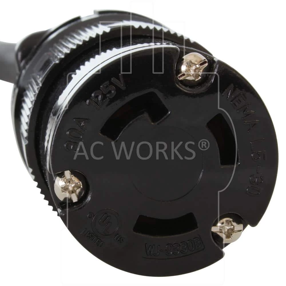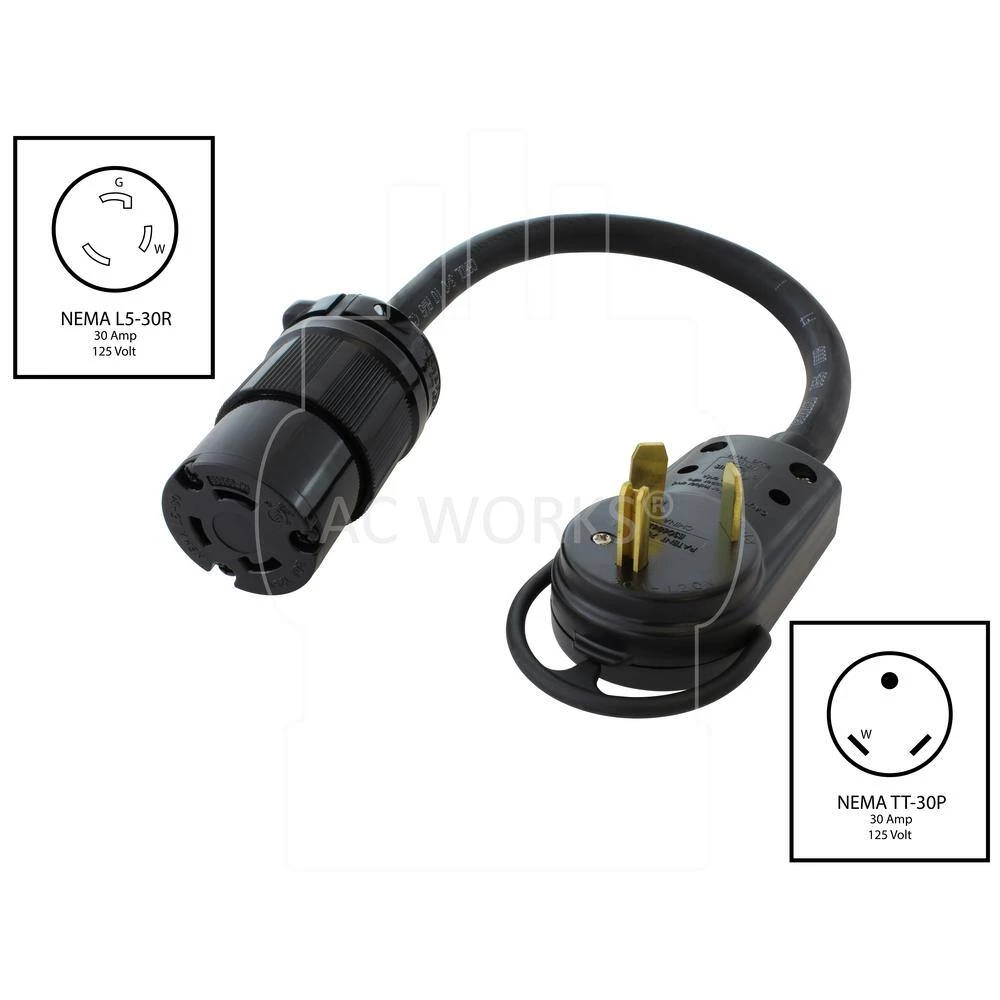 This AC WORKS brand adapter cord [TT30L530-018] is very durable. It is a 1.5 ft. cord with a NEMA TT-30P to a NEMA L5-30R. This 3-prong adapter is heavy-duty and is used to get 125-Volt power from a generator or campground power pedestal. It can be used for RVs, food trucks, and even emergency power. The cord is flexible and durable as well as weather and water-resistant. Included with your purchase is a 5-year limited warranty.