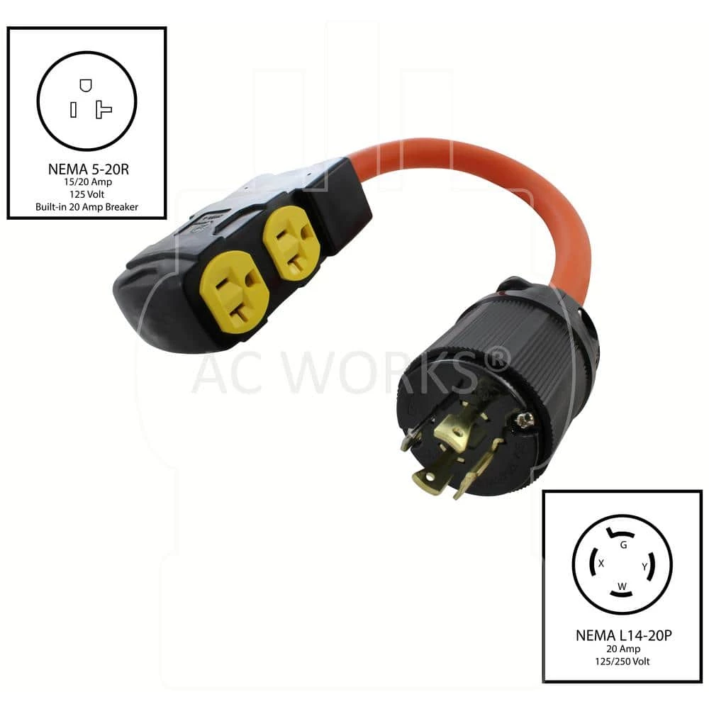 This AC WORKS brand generator power strip cord [L1420CBF520] is very durable. The cord is 1.5-feet in length and is a NEMA L14-20P to four NEMA 5-15/20R household outlets. The NEMA 14-20P is a 20 Amp, 125/250 Volt straight-blade plug. The NEMA 5-15/20R is a 20 Amp, 125 Volt, T-blade household female connector. The cable is an STW, 10/4, 30 Amp copper wire with a 600 Volt anti-cold weather jacket that stays flexible in extreme temperatures. The cord is super durable and typically used with a generator, construction, and industrial equipment. Included with your purchase is a 5-year limited warranty.