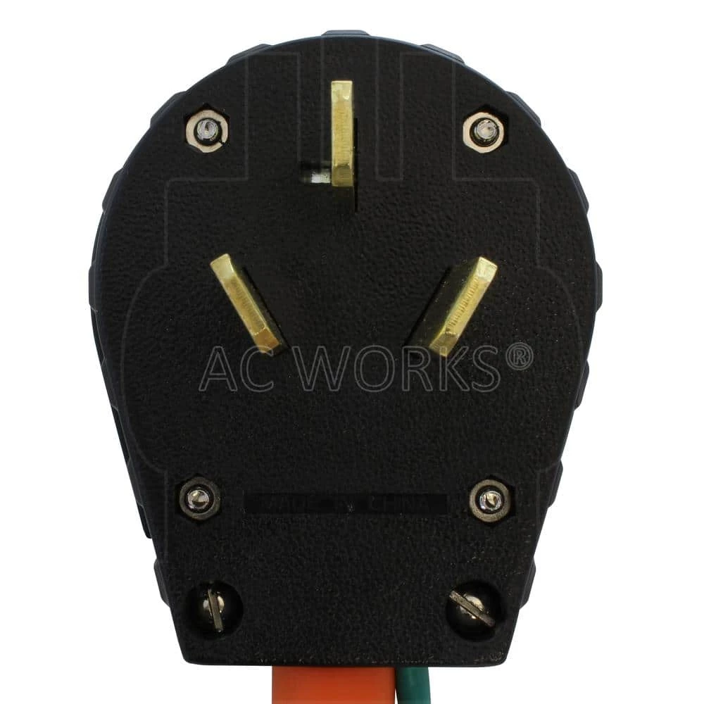This AC WORKS brand protective adapter is a heavy-duty household adapter cable. This 1.5-foot cord is a NEMA 10-50P to NEMA 5-15/20R, the NEMA 10-50P is a 50 Amp, 3-prong dryer male plug, the NEMA 5-15/20R is a 15/20 Amp, T-blade female connector, the cable is an STW, 10/3, anti-cold weather cable staying flexible in extreme temperatures, the cord is super durable and typically used in a residential setting, you must use the green grounding wire to get 120V power from your dryer outlet. Included with your purchase is a 5-year limited warranty.