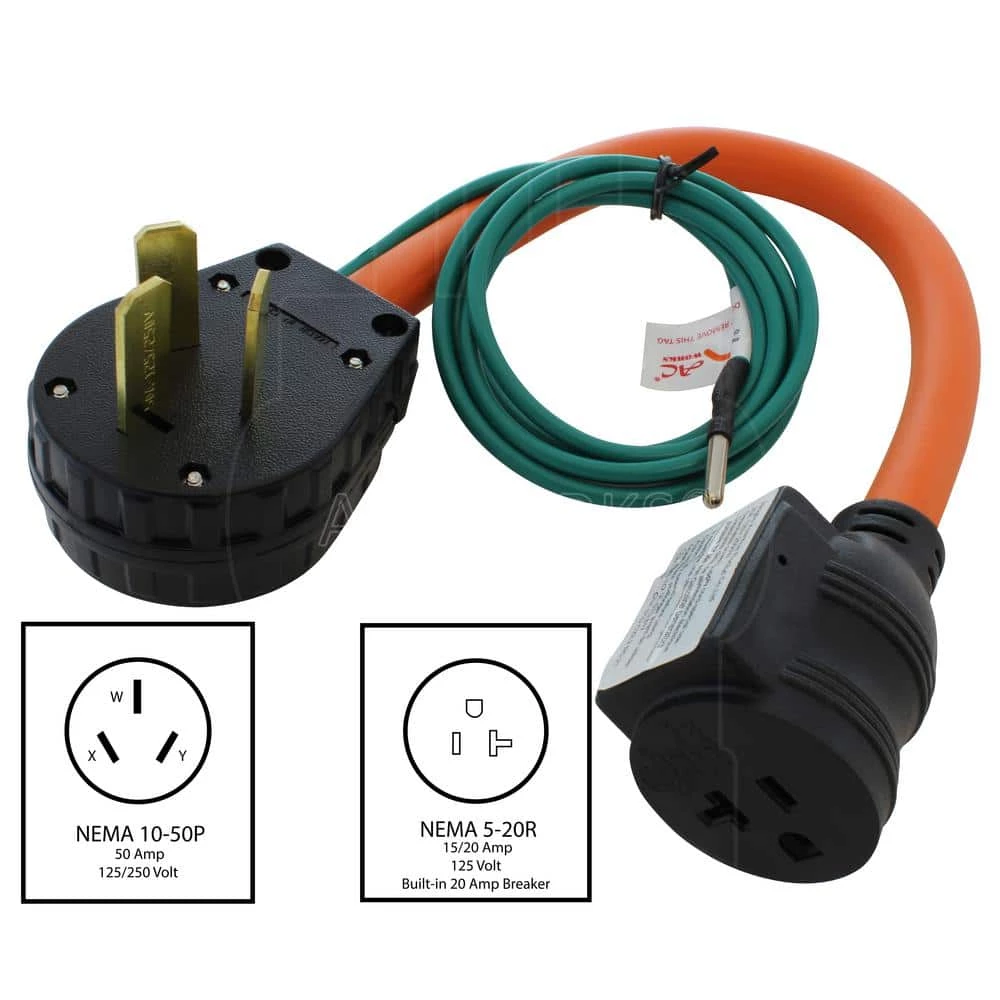 - NEMA 10-50P to NEMA 5-15/20R with 20 Amp breaker