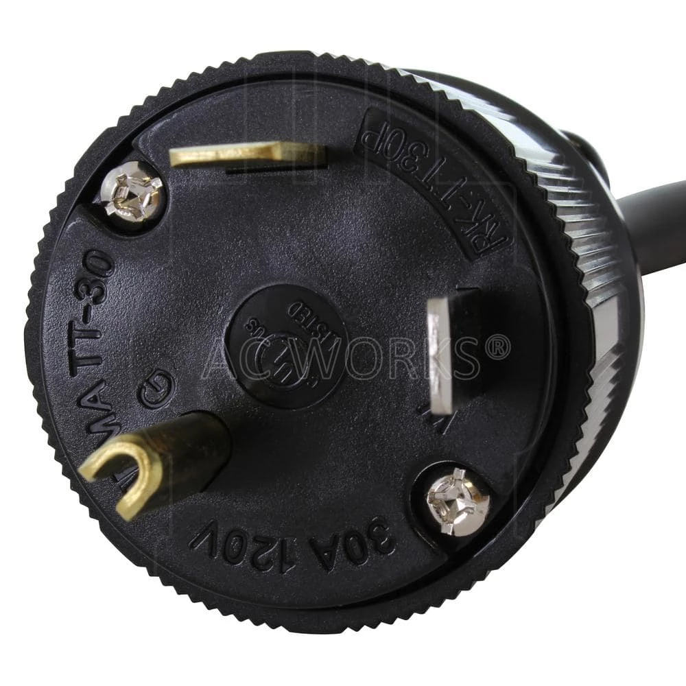 - NEMA TT-30P, 30 Amp, 125-Volt, RV/trailer male plug
