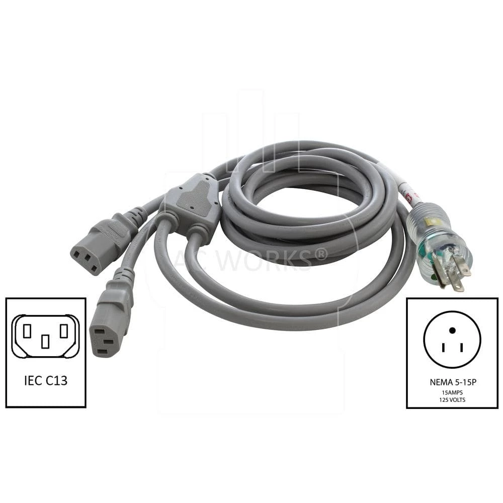 This AC WORKS brand Medical Grade 10 Amp power cord is 10ft in length with a NEMA 5-15P green dot plug, to two IEC C13 female connectors. This product can be used for computers, servers, medical carts, hospital beds, and other hospital equipment. Included with your purchase is a 5-year limited warranty.
