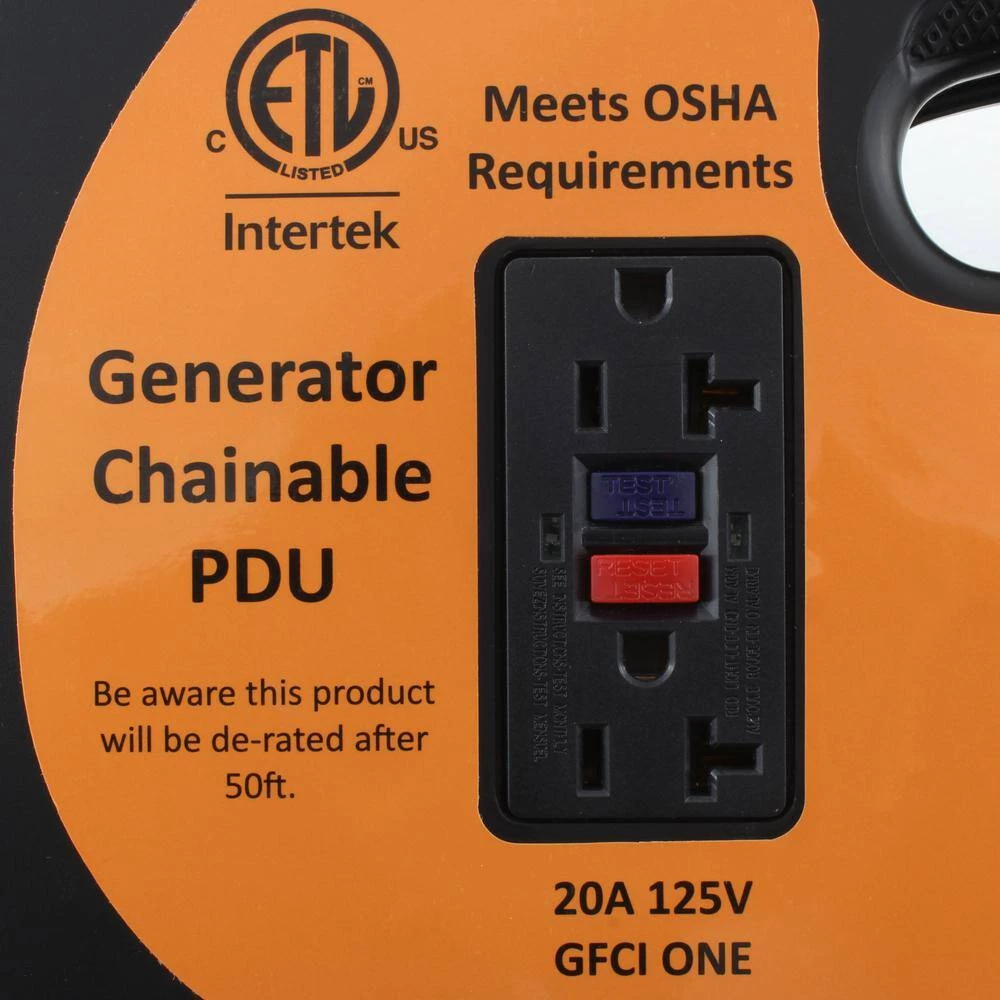 This AC WORKS brand chainable PDU with 10ft extension cord [PD4GF-010] meets OSHA requirements and is ETL approved. It features heavy-duty outlets and an anti-cold weather jacket, which keeps the cord flexible in harsh temperatures. This generator extension cord has a NEMA L14-30P, 30 Amp, 125/250 Volt, locking plug to (4) GFCI NEMA 5-15/20R, 20 Amp, T-blade household female connectors. There is also an L14-30R outlet, allowing you to chain multiple PD4GF-010 cords together. The Female GFCI outlets come with power indicator lights and the cable is an SJTW, 10/4, 30 Amp copper wire, with 300 Volt anti-cold weather jacket. Included with your purchase is a 5-year limited warranty. This Cord is perfect for any indoor/outdoor events, fairs, conventions, construction sites, and more. Please be aware of the max power for this product is 7500 Watts overall. It is important you fully extend the cord when using this product to “daisy chain” or “piggyback” connecting multiple extensions to one another. NOTE: The GFCI Outlet is a ground-fault circuit interrupter which protects people from electrical shock. This type of circuit breaker shuts off electric power when it senses an imbalance between the outgoing and incoming current. Four NEMA 5-15/20, 20 Amp, GFCI T-blade household connectors, with green power indicator and a red indicator which flashes for 2 seconds continuously and flash every minute (Self-test Function).