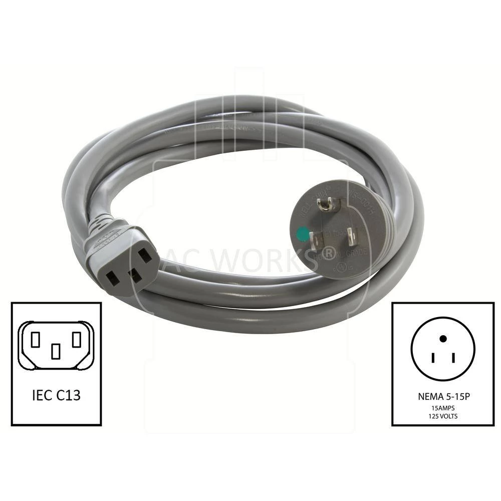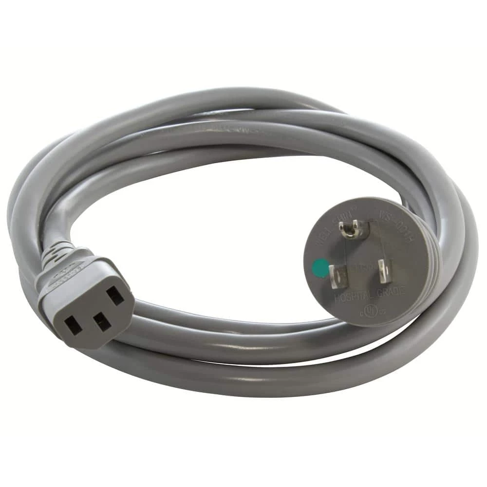 This AC WORKS brand medical grade power cord is 6-feet in length. It is a NEMA 5-15P to IEC C13. The cord is an SJTW, 14/3 hospital grade power supply cord. This green dot medical power supply cord has a NEMA 5-15P, 15 Amp, 125 Volt medical grade plug connected to an IEC C13 Computer/Medical Devices/IT/CPU/Server End. Included with your purchase is a 5-year limited warranty.