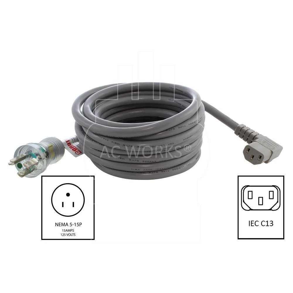 This AC WORKS brand 15 Amp Medical Grade power cord is 15 ft. long with a NEMA 5-15P green dot plug, to a le ft. angle IEC C13 female connector. This product can be used for computers, servers, medical carts, hospital beds, and other hospital equipment. Included with your purchase is a 5-year limited warranty.