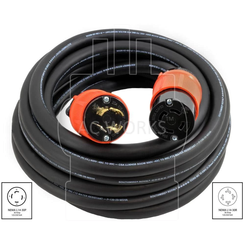 This AC WORKS brand 25 ft. L14-30 extension cord is heavy-duty and made of durable construction, the cable is Soow, 10/4, 30 Amp copper with a 600-Volt rubber jacket, the jacket will stay flexible in extremely cold weather. This cord is popular for use with transfer switches and inlet boxes, generators, industrial use and construction, the extension cord is backed with a 5-year limited warranty.