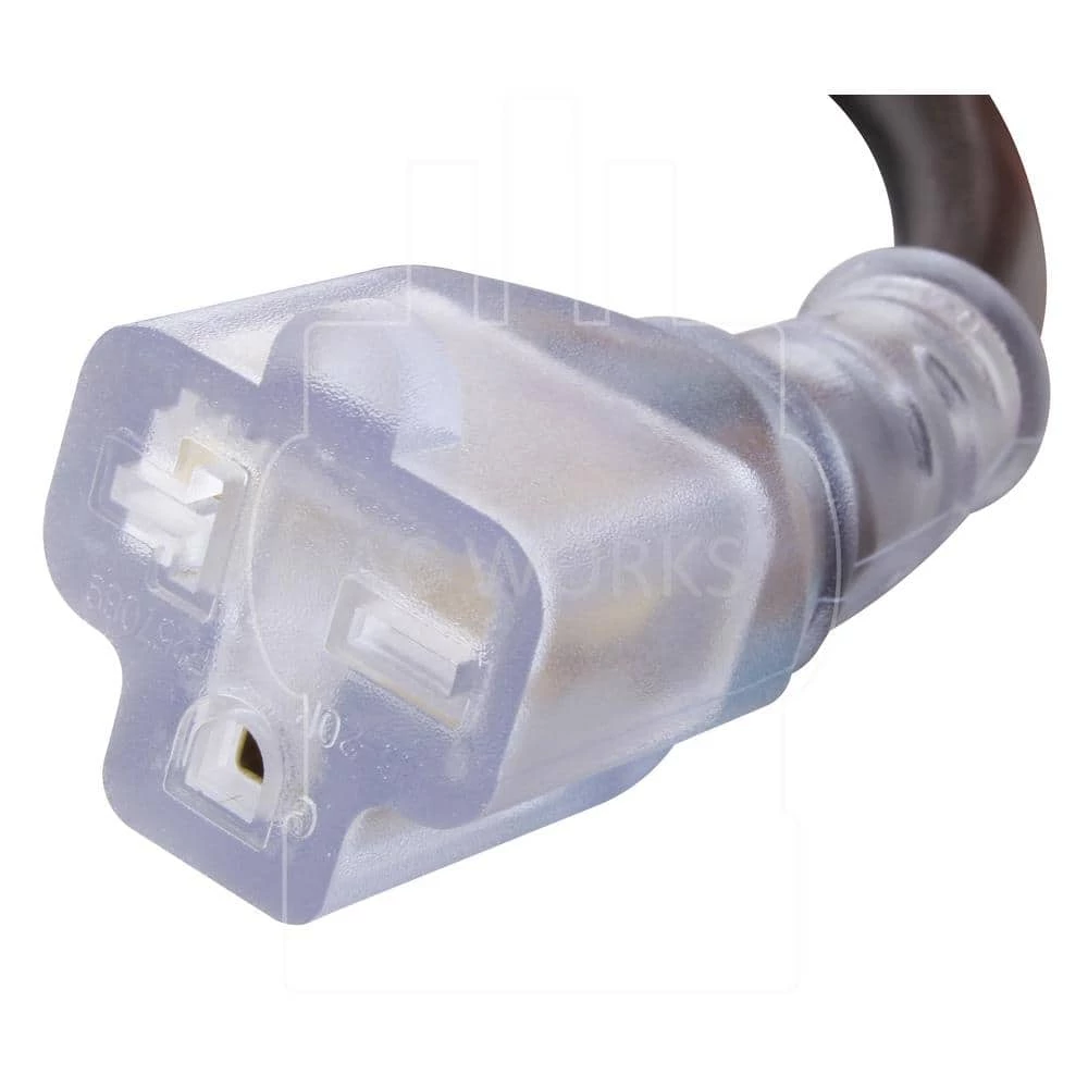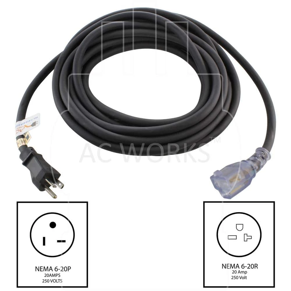 This AC WORKS brand NEMA 6-20 extension cord [S620PR] is used as an indoor/outdoor extension cord. The cable contains an anti-cold weather jacket which stays flexible in extreme temperatures. It is a NEMA 6-20P straight-blade plug to NEMA 6-15/20R straight T-blade connector with a power indicator light. Included with your purchase is a 5-year limited warranty.
