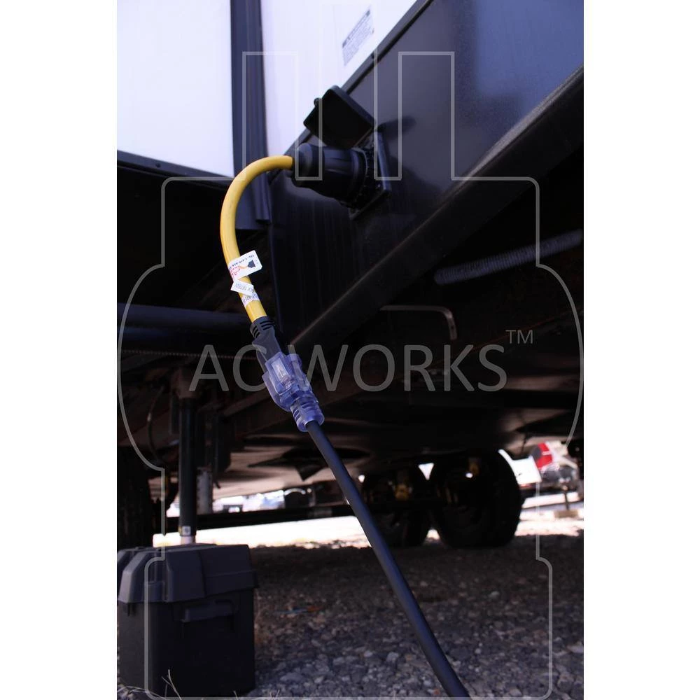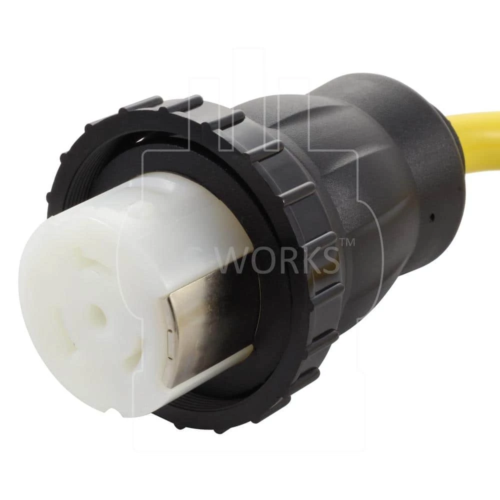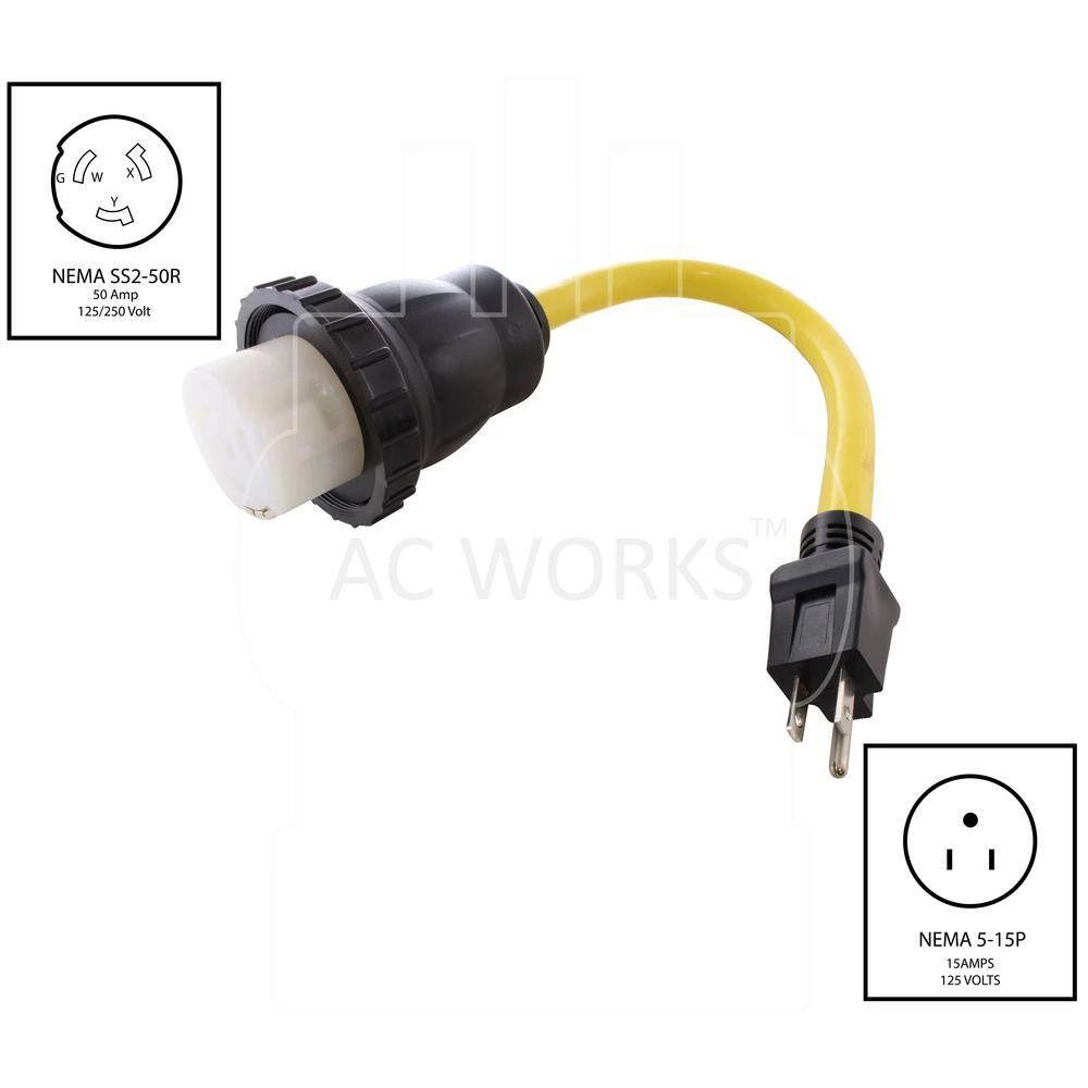 This AC WORKS brand RV/Marine generator adapter [S515M50-018] is very durable. This adapter is 1.5-feet in length and is a NEMA 5-15P to NEMA SS2-50R. The NEMA 5-15P is a 15 Amp, 125 Volt regular household plug. The NEMA SS2-50R is a 50 Amp, 125/250 Volt locking female RV/Marine connector. The cable is an STW, 10/3, 600 Volt, 30 Amp copper wires. This product features nickel-plated pins and terminals to prevent rusting and has a maximum operating power of 1875 Watts. Included with your purchase is a 5-year limited warranty.