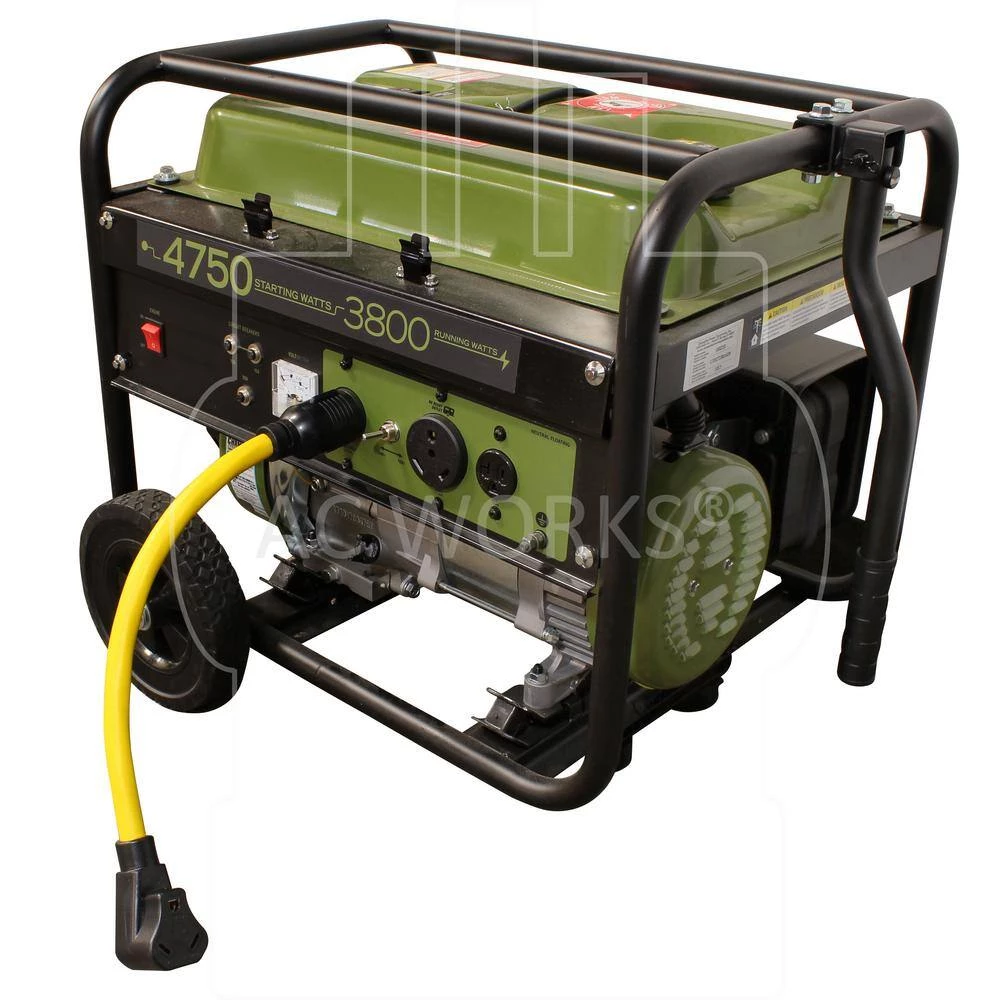 This AC WORKS brand RV Generator adapter [RVL1430TT-018] is 1.5-feet in length and is a NEMA L14-30P to NEMA TT-30R. The NEMA L14-30P is a 30 Amp, 125/250 Volt locking male plug. The NEMA TT-30R is a 30 Amp, 125 Volt female connector. This adapter has a maximum operating power of 3750 Watts and is backed by a 5-year limited warranty.