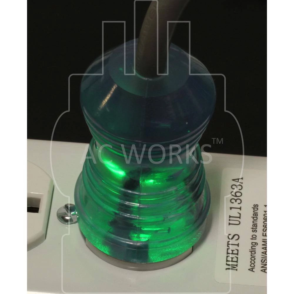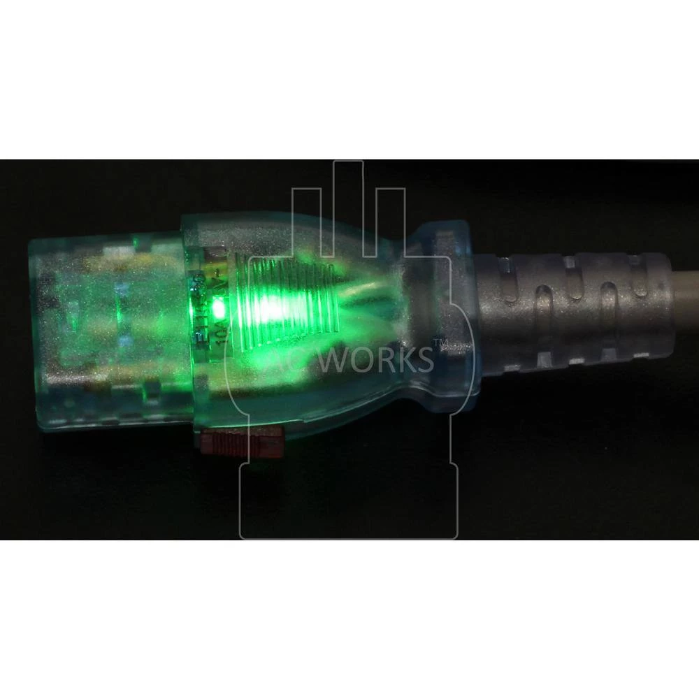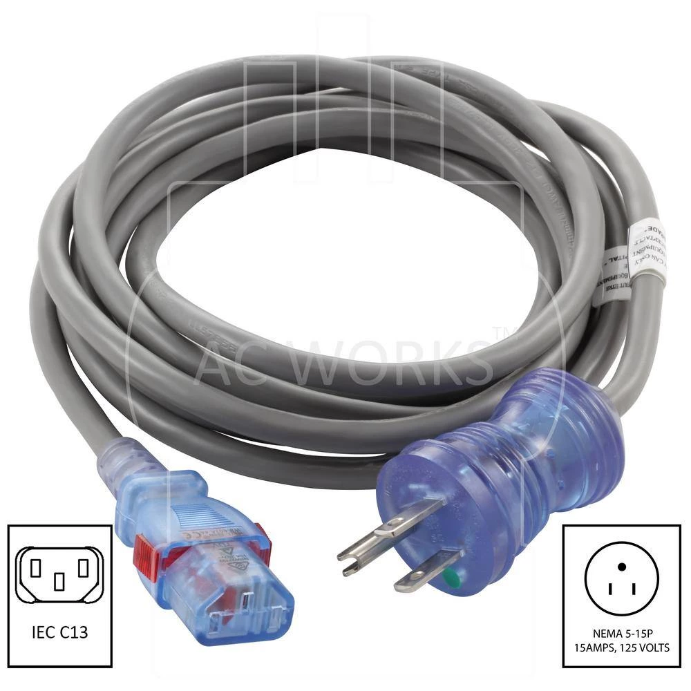 This is AC WORKS medical grade power cord. This medical supply cable is a 10 ft. SJTW 18/3 hospital grade cord. It has a NEMA 5-15P, 15 Amp, 125-Volt, green dot medical grade plug to medical devices, computer, IT, CPU and locking IEC C13. Both ends contain a power indicator light. Included with your purchase is a 5-year limited warranty.