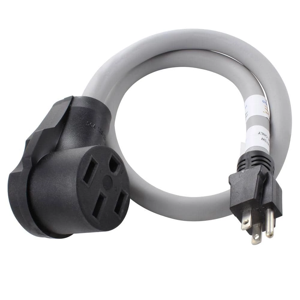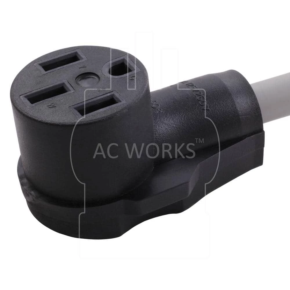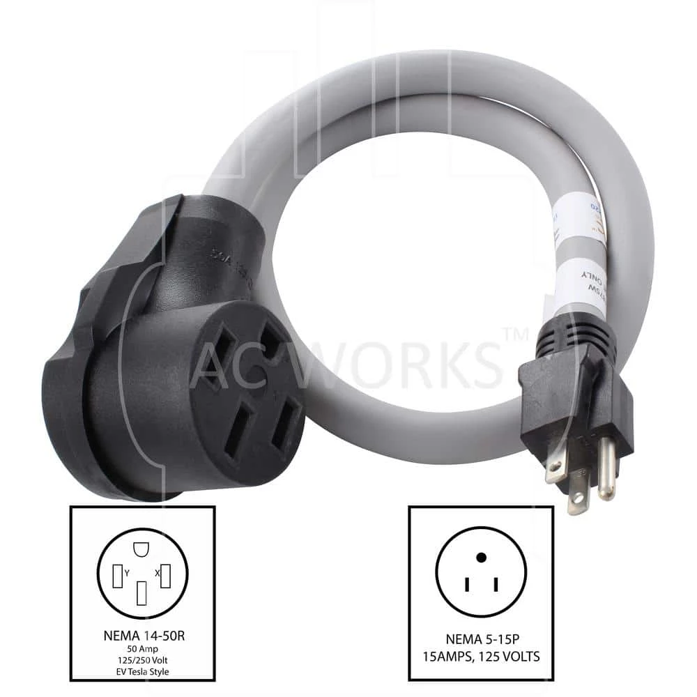 This AC WORKS brand [EV515MS-036] super durable EVSE charging adapter is compatible with the Tesla Model S/X/3. The adapter is a NEMA 5-15P to NEMA 14-50R. The NEMA 5-15P is a 15 Amp, 125-Volt, regular household male plug. The NEMA 14-50R is a 50 Amp, 125/250-Volt, 4-prong straight-blade female connector. The adapter is 3 ft., in length, cable with an STW heavy-duty 10/3, 600-Volt jacket with a 30 Amp copper wire.