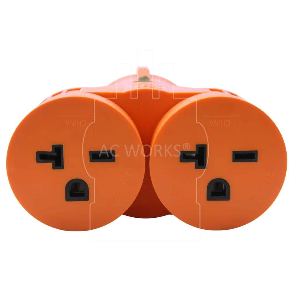 This AC WORKS brand V-DUO is a super durable generator adapter with a compact design. The product is an L6-30P, 30 Amp, 250-Volt, 3-prong locking male plug to two 6-20R, 20 Amp, 250-Volt, 3-prong female connectors. The adapter features nickel-plated plugs and terminals to prevent rusting and a power indicator light. Included with your purchase is a 5-year limited warranty.