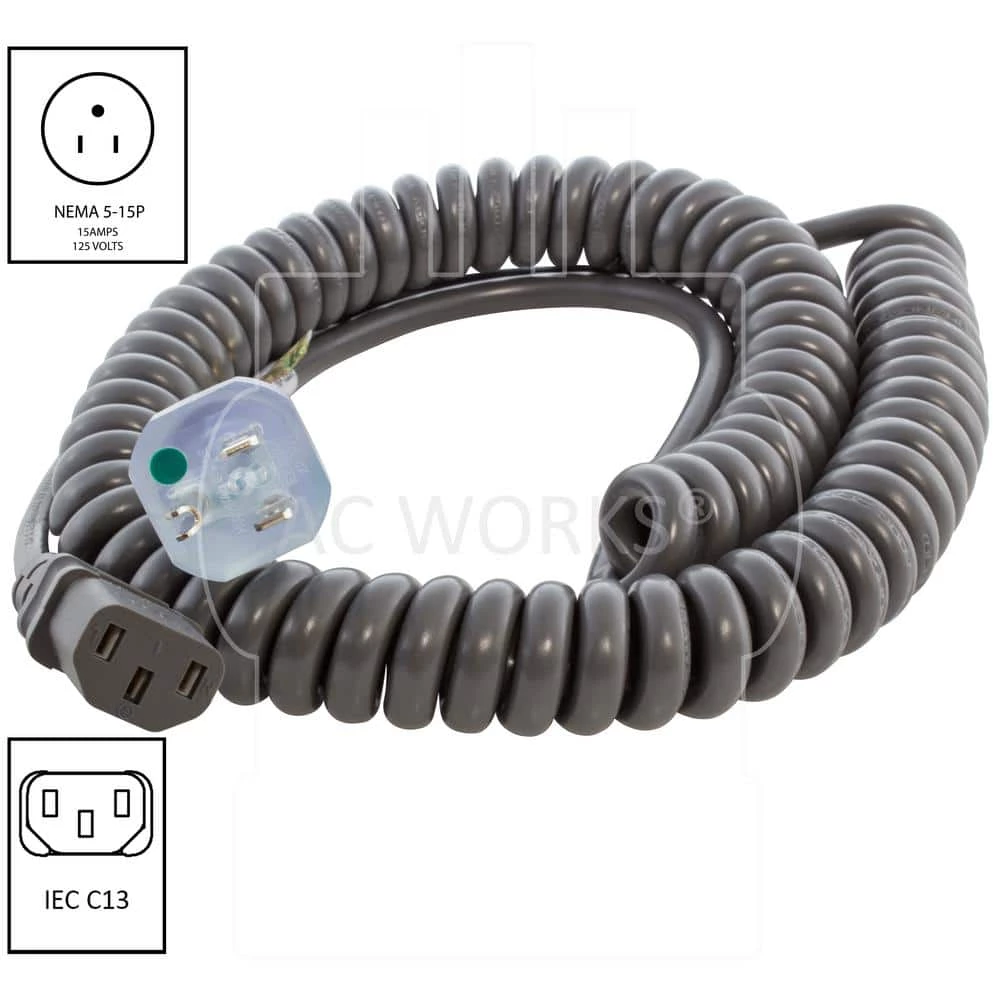 This AC WORKS brand coiled medical grade power cord has a working length of up to 10 ft. It is a NEMA 5-15P green dot plug to an IEC C13 connector. This product can be used for computers, servers, medical carts and other hospital equipment. Included with your purchase is a 5-year limited warranty.