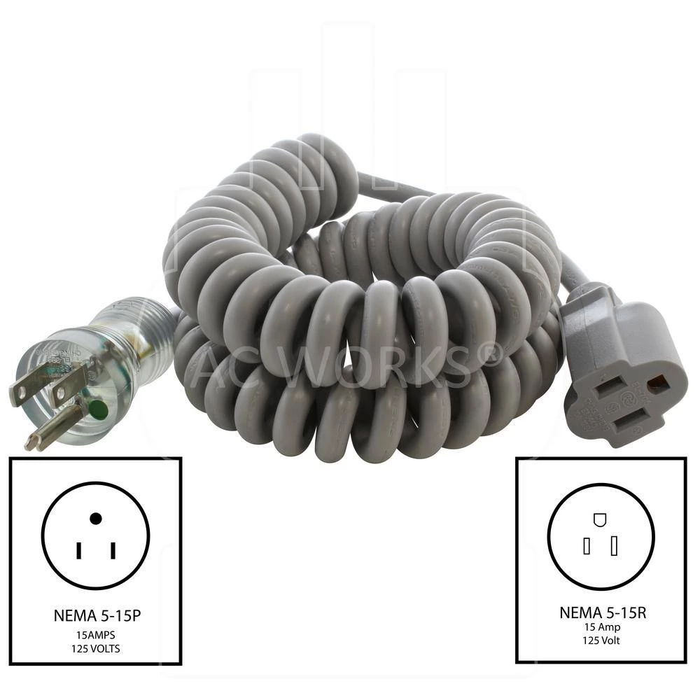 This AC WORKS brand coiled Medical Grade power cord has a working length of up to 6.5ft. It is a NEMA 5-15P green dot plug to a NEMA 5-15R female connector. This product can be used for computers, servers, medical carts, hospital beds, and many other hospital applications. Included with your purchase is a 5-year limited warranty.