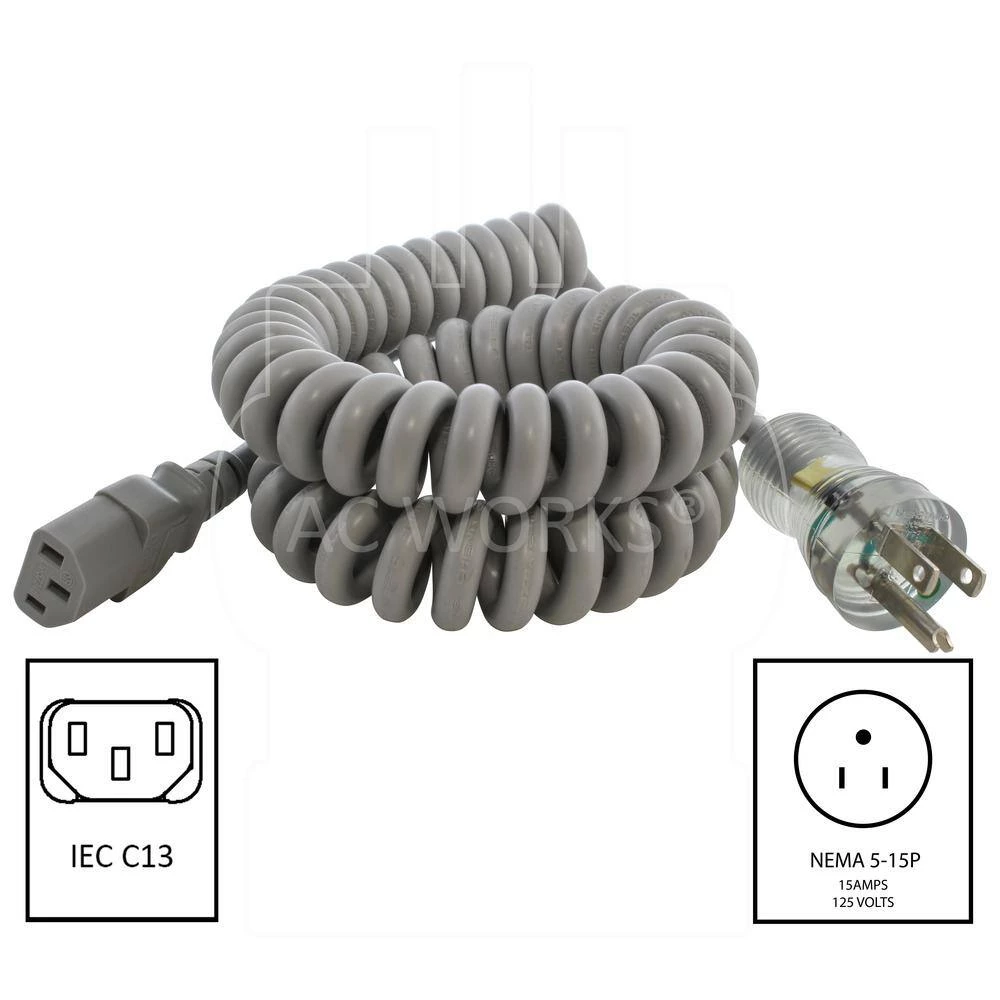 This AC WORKS brand coiled Medical Grade power cord has a working length of up to 6.5ft. It is a NEMA 5-15P green dot plug to an IEC C13 connector. This product can be used for computers, servers, medical carts, and other hospital equipment. Included with your purchase is a 5-year limited warranty.