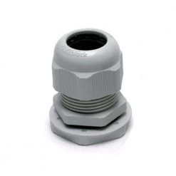A cable gland is used to keep dust and liquids from entering a panel or box for wire entry. This cable gland can be threaded onto matching M20 x 1.5 threads or used with the included locknut on panels less than 10 mm thick. The mounting hole should be 20 mm. The sealing ring of the strain relief cable gland is made of a flexible Neoprene to securely hold a single wire with a 7 mm to 13 mm diameter clamping range. It operates in a temperature range from minus 20°C to 90° C. The light gray is made from polyamide PA6.6 and is IP68, NEMA 6P. UL Listed.