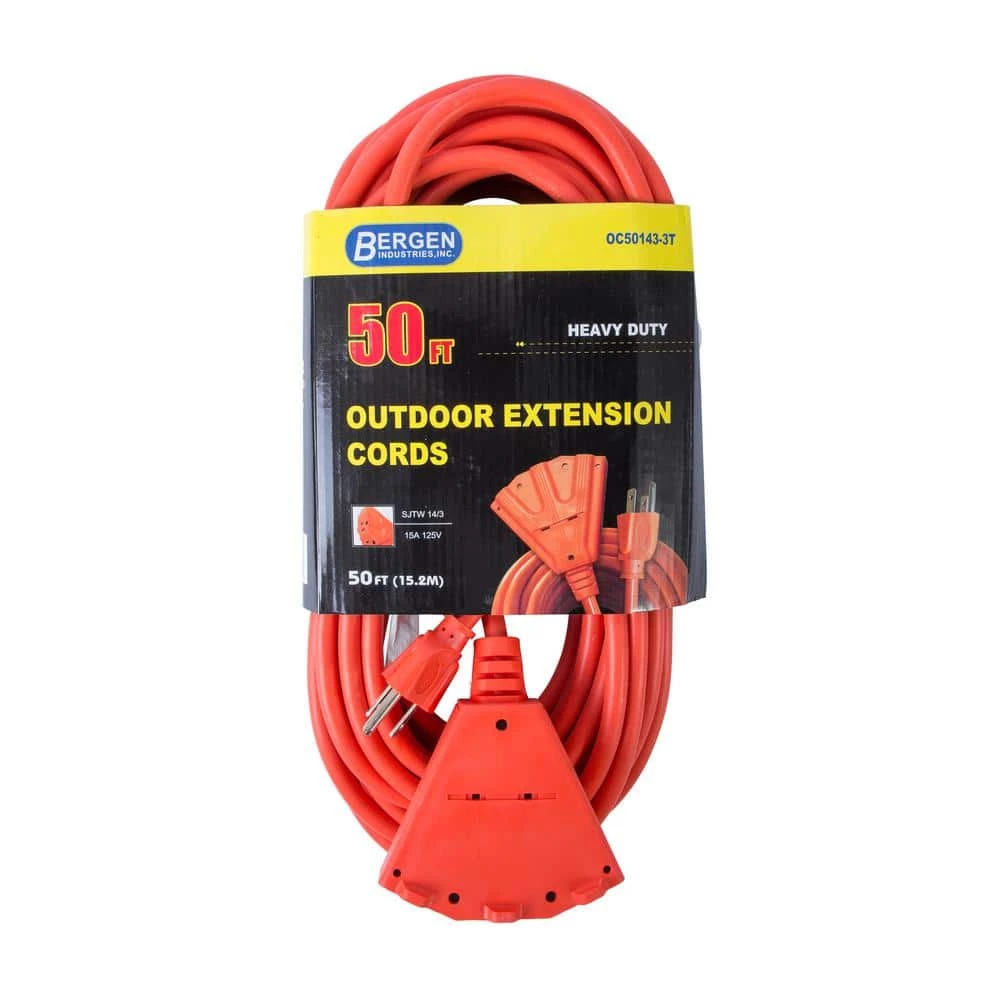 The Bergen heavy duty, super flexible extension cord is manufactured to withstand everyday use on job sites. Molded plug and connector ends with a high visibility orange SJTW jacket provides both weather and UV resistance for longer life. Triple tap connector end, with power indicator, allows for multiple connections to a single cord. 14/3 AWG cable meets the requirements of most applications. ETL approved for outdoor use.