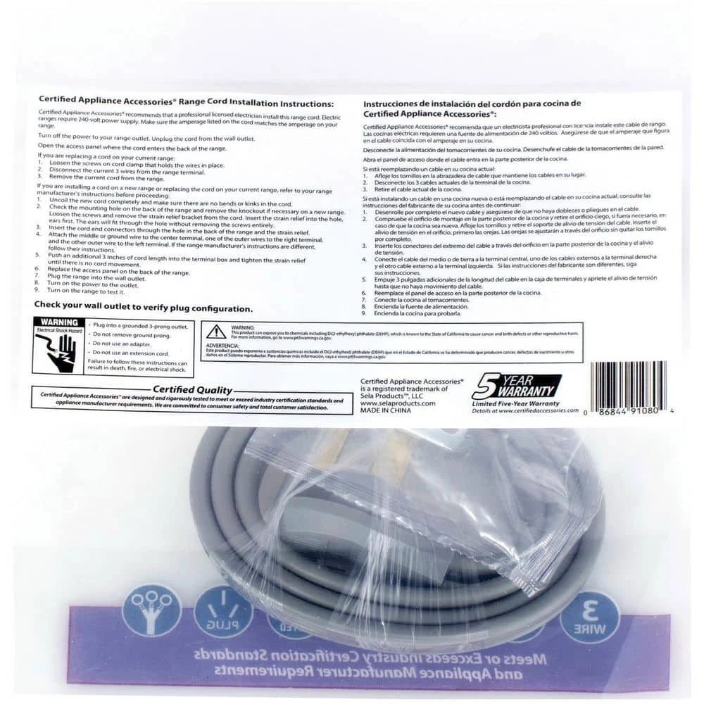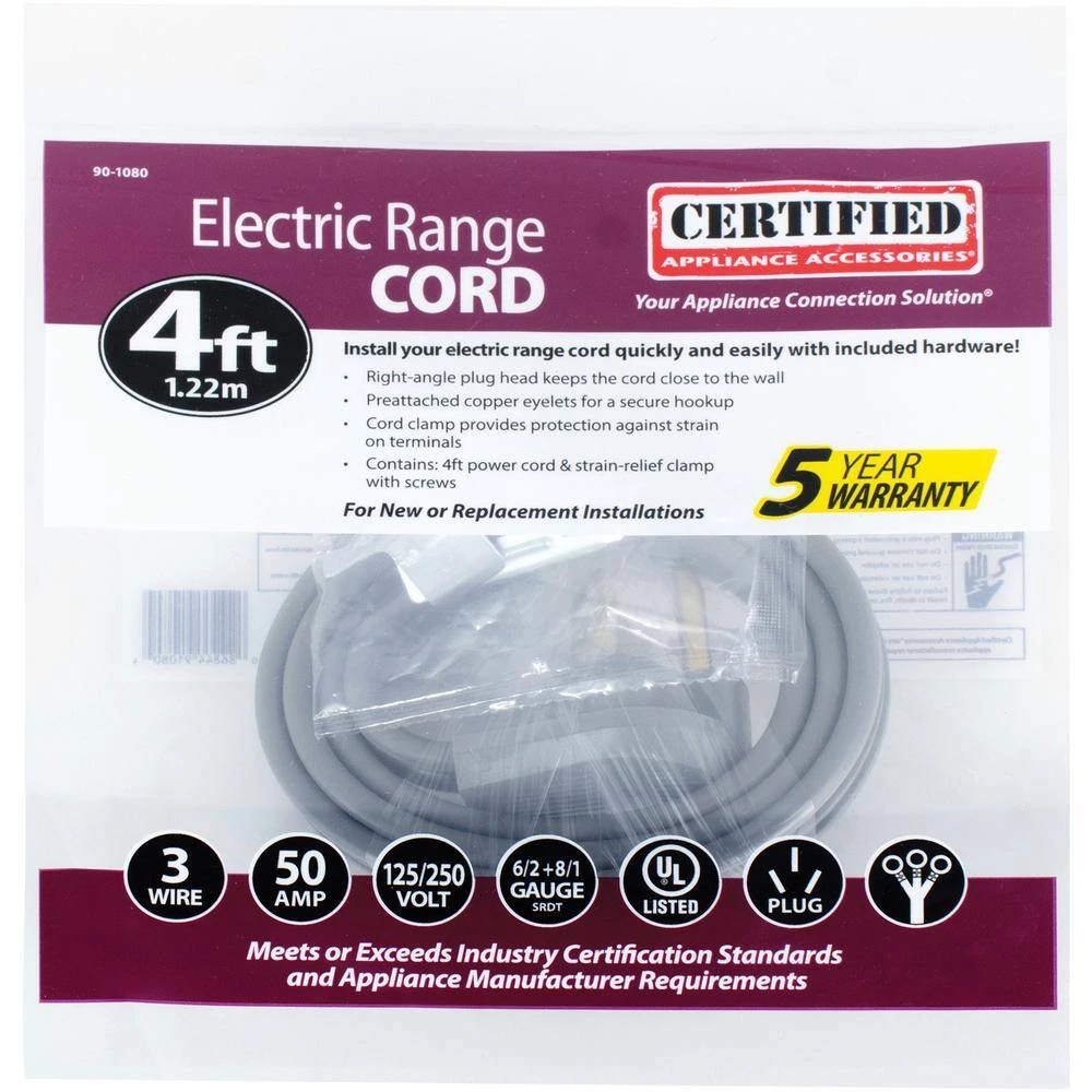 For years, licensed plumbers, electricians and appliance installers have relied on CERTIFIED APPLIANCE ACCESSORIES for their power cords, hoses and connectors. Now you can too. Enjoy the convenience offered by this 4 ft. range cord from CERTIFIED APPLIANCE ACCESSORIES. Its flexibility and durability ensure a reliable connection for your next home installation project. This high-quality range cord has been thoroughly tested and is backed by a 5-year limited warranty. Follow the illustrated, step-by-step directions included in the packaging. Always consult your appliances installation instructions. Check your appliance’s manual for the correct specifications to ensure this is the right cord for you. Thank you for choosing CERTIFIED APPLIANCE ACCESSORIES Your Appliance Connection Solution.