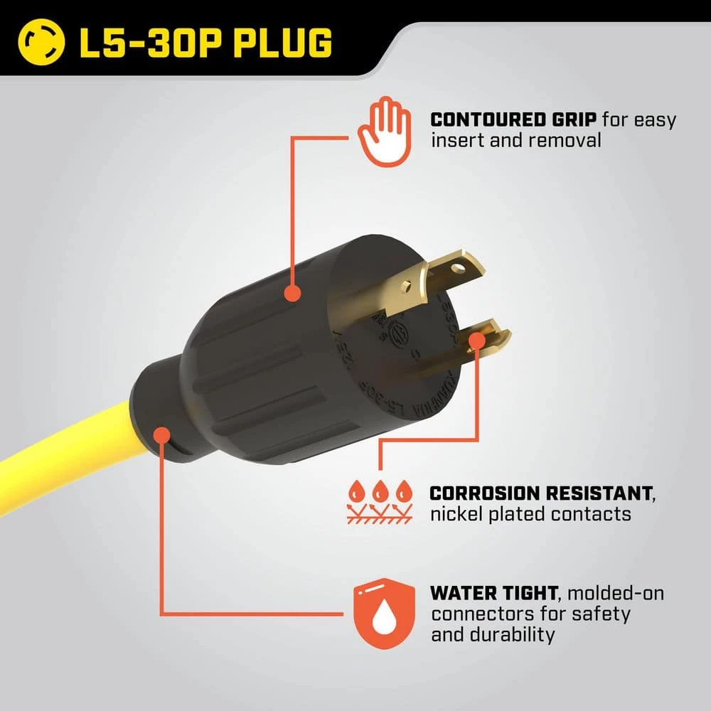 The Champion Power Equipment 48034 25-Foot 30-Amp 125-Volt Generator Extension Cord changes your L5-30R locking outlet to three 5-15R household outlets. Whether you’re powering your essential items during an emergency or powering up your tools in remote locations, Champion’s 25-foot extension cord can be depended upon in any situation. Designed in a fan-style configuration, this cord provides convenient access to your generator’s power. Ideal for quick and dependable use of power, this 25-foot, high-capacity 10-Gauge wire is surrounded by durable, outdoor-rated insulation (SJTW). Featuring a heat and cold resistant thermoplastic jacket, you can be sure your power cord will remain flexible and function perfectly whether the temperature outside is extremely hot or extremely cold. Champion’s convenient extension cord is rated for use with 125-Volts and extends 30 amps of generator power where you need it. The 25-foot long cord allows you to run your generator from a safe distance, protecting you and others from noise and hazardous exhaust. Champion Support and our nationwide network of service centers will back up your purchase with a 1-year limited warranty and free lifetime technical support.