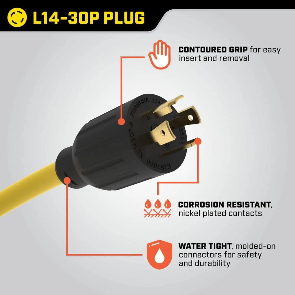 The Champion Power Equipment 48036 25 ft. 30 Amp 240-Volt Generator Extension Cord changes your L14-30R locking outlet to four 5-20R household outlets. Whether you’re powering your essential items during an emergency or powering up your tools in remote locations, Champion’s 25 ft. extension cord can be depended upon in any situation. Designed in a fan-style configuration, this cord includes dust covers to keep your outlets clean and protected when not in use. Ideal for quick and dependable use of power, this 25 ft., high-capacity 10-Gauge wire is surrounded by durable, outdoor-rated insulation (SJTW). Featuring a heat and cold resistant thermoplastic jacket, you can be sure your power cord will remain flexible and function perfectly whether the temperature outside is extremely hot or extremely cold. Champion’s convenient extension cord is rated for use with 125-Volt/250-Volt and extends 30 Amp of generator power where you need it. The 25 ft. L cord allows you to run your generator from a safe distance, protecting you and others from noise and hazardous exhaust. Champion Support and our nationwide network of service centers will back up your purchase with a 1-year limited warranty and free lifetime technical support.