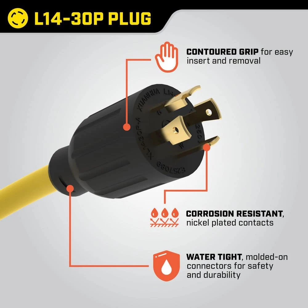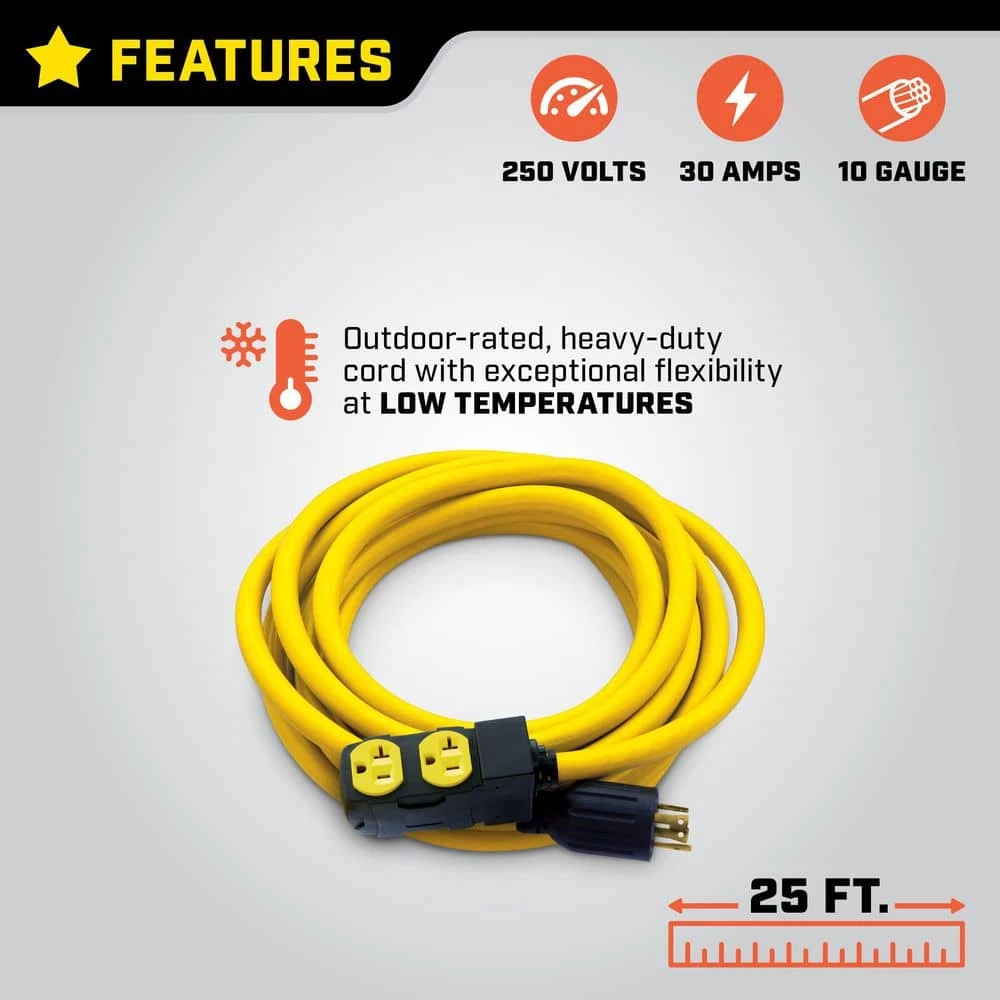 The Champion Power Equipment 48043 25 ft. 30 Amp 125-Volt/250-Volt Generator Extension Cord changes your L14-30R locking outlet to four circuit breaker protected 5-20R household outlets. Whether you’re powering your essential items during an emergency or powering up your tools in remote locations, Champions 25 ft. extension cord can be depended upon in any situation. Designed in a duplex-style configuration, this cord features circuit breakers which will protect your household items from unexpected power surges. Ideal for quick and dependable use of power, this 25 ft., high-capacity 10-Gauge wire is surrounded by durable, outdoor-rated insulation (SJTW). Featuring a heat and cold resistant thermoplastic jacket, you can be sure your power cord will remain flexible and function perfectly whether the temperature outside is extremely hot or extremely cold. Champions convenient extension cord is rated for use with 125-Volt/250-Volt and extends 30 Amp of generator power where you need it. The 25 ft. L cord allows you to run your generator from a safe distance, protecting you and others from noise and hazardous exhaust. Champion Support and our nationwide network of service centers will back up your purchase with a 1-year limited warranty and free lifetime technical support.