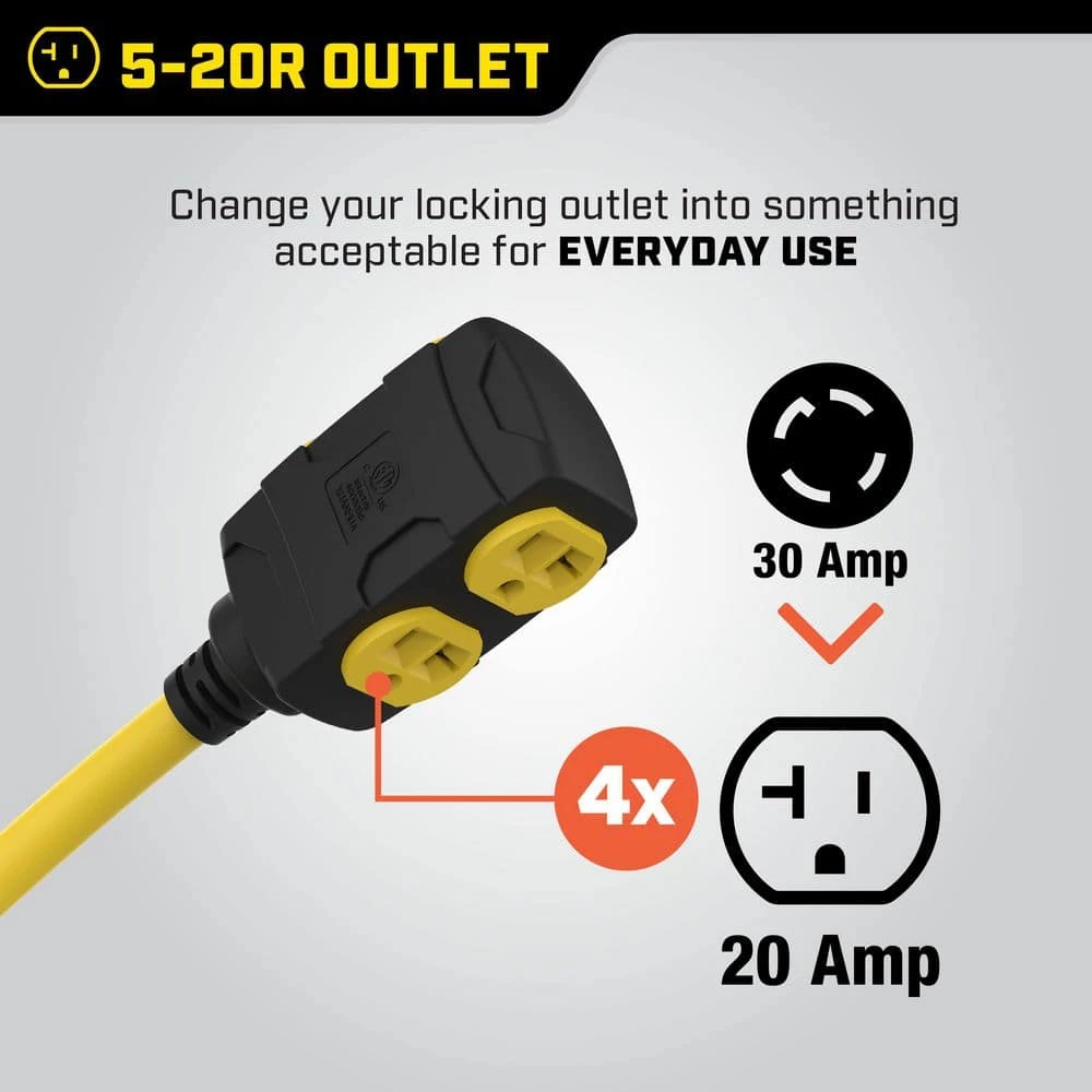 - Converts a 30 Amp locking outlet to 4 circuit breaker protected 20 Amp household outlets and extends your power up to 25 ft.