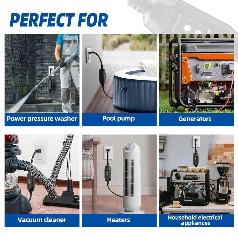 - Wide application – perfect for indoor or outdoor use in a variety of electrical equipment, such as generators, cleaning machine, power pressure washer, pool pump, generators, vacuum cleaner, pumps, heaters, household electrical appliances, cord-and-plug-connected high-pressure spray washing machines,tire inflation machines, dishwashers, etc.