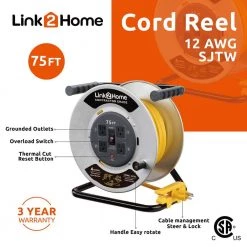 Link2Home 75 ft. 12/3 Extension Cord Storage Reel with 4 Grounded Outlets and Surge Protector