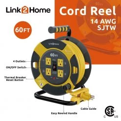 Link2Home 60 ft. 14/3 Extension Cord Storage Reel with 4 Grounded Outlets and Surge Protector