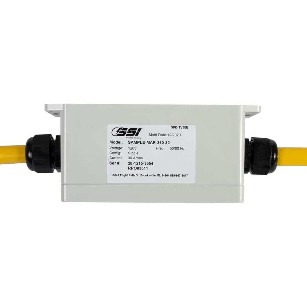 FIRST DEFENSE 250-series Marine Surge Protector offers the best portable surge protection available for your boats 30 Amp, 120-Volt electrical system. The 250-series Marine Surge Protector features All Mode Protection, protecting Line to Neutral, Line to Ground and Neutral to Ground from power surges originating from your shore power connection. While these surges typically do not cause instantaneous damage, they cause cumulative damage as these extremely fast, low power surges bombard sensitive, micro-processor based equipment on-board your boat. Our 250-series Marine Surge Protector comes standard with EMI/RFI filtering to protect against transient electrical surges. We believe our 250-series marine surge protector is the best in the industry with 120,000 Amp Total Peak Surge Current protection for those nearby lightning strikes which can enter your boat’s electrical system from its shore power connection. We lead the industry in let-through voltage performance. Our 250-series marine surge protectors offer circuitry encapsulation to protect the SPD’s circuits from weather and vibration. In addition, while others offer a weather resistant box, we use NEMA 4X liquid tight enclosures, the ultimate for weather resistance to extend the life of your surge protector.