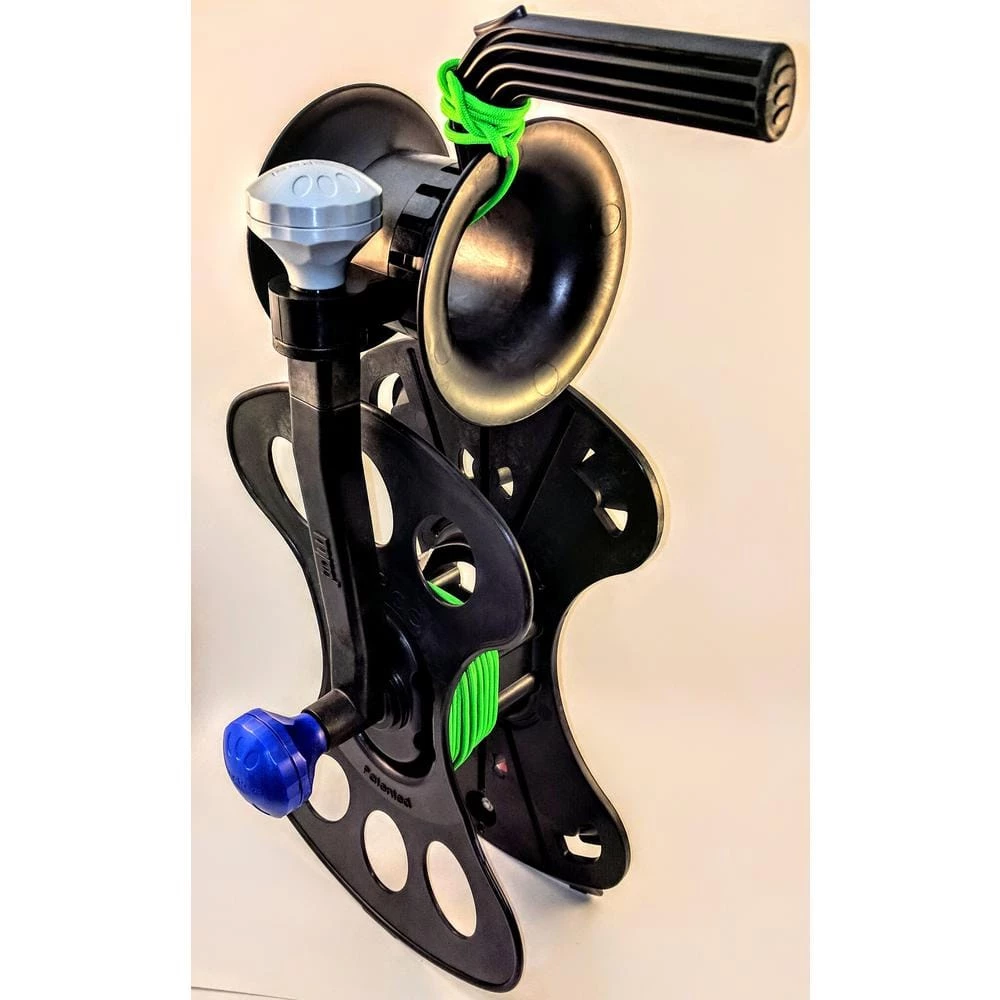 The FreeReel Cord/Hose Management System gives you the freedom to use your air hoses, extension cords, cables, garden hoses in the ways you want and need. Imagine your hoses and cords out of the way and neatly coiled and stored when not in use, but very conveniently and quickly placed into use when you need them. The FreeReel System provides unparalleled flexibility in managing all aspects of using hoses and cords. The patented precision cord/hose guide/winder physically guides the cord or hose on to the storage reel during coiling. This means you do not need to use your hand to guide the cord or hose, keeping your hand clean and the cord or hose untangled. Once the cord or hose has been wound on the storage reel, the user carries the FreeReel with the cord or hose, using the integrated handle and stores both the cord or hose and storage reel in the wall storage mount. Now everything is out of the way and neatly stored, ready for the next use. When removing the cord or hose from the reel for use, the user simply puts a hand on the integrated handle, with their thumb on the thumb rest pointing the direction to unwind. And then the user walks in the direction where the cord or hose will be used, all the while laying the cord neatly on the ground.