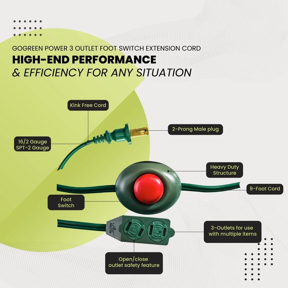 The GoGreen Power 3-outlet foot switch extension makes it simple to turn on and off your items with the ease of step. Easy setup and only takes seconds. Great use for table lamp, Christmas trees and much more.