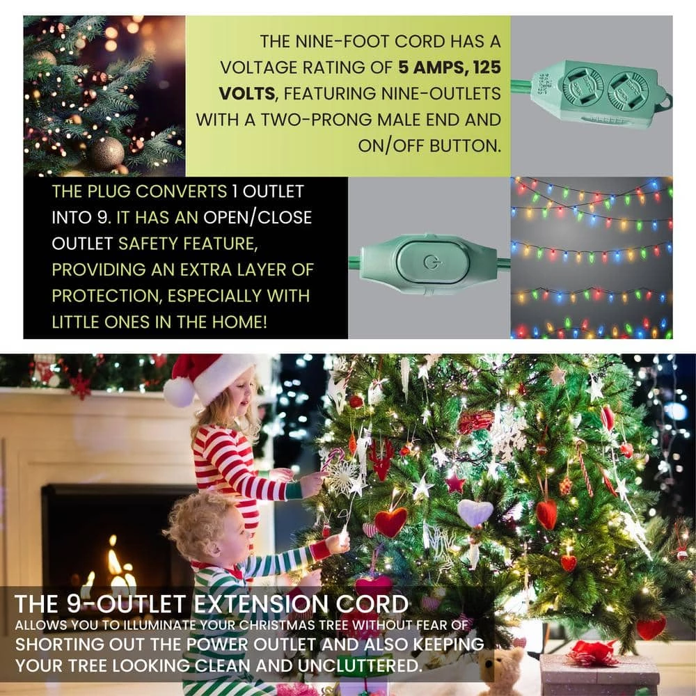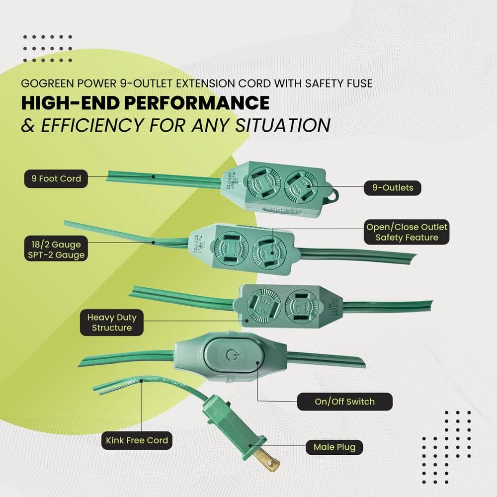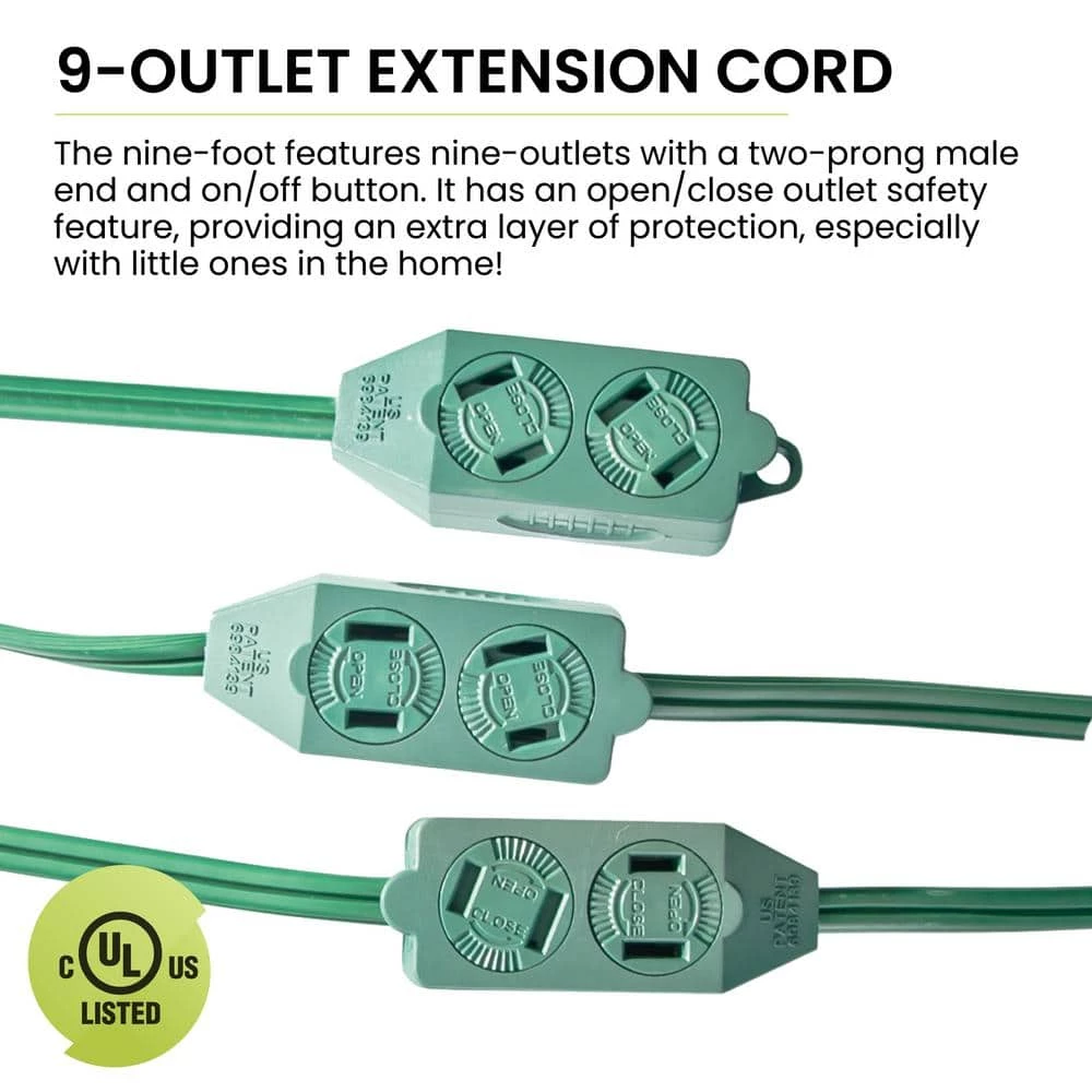 The GoGreen Power 9-outlet 9 ft. extension cord will cover all your needs where multiple outlets are needed. The cord only contains 2-prong outlets. Great use is for your holiday decorations of Christmas tree.