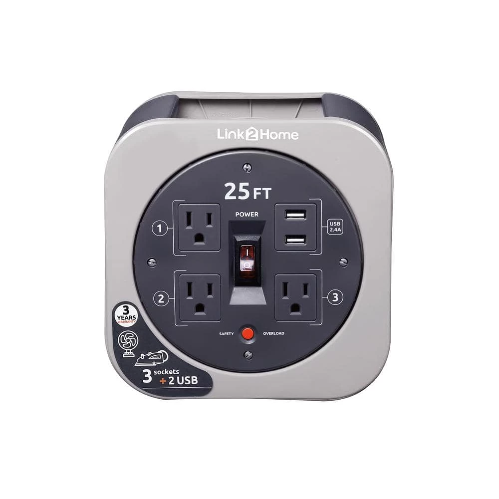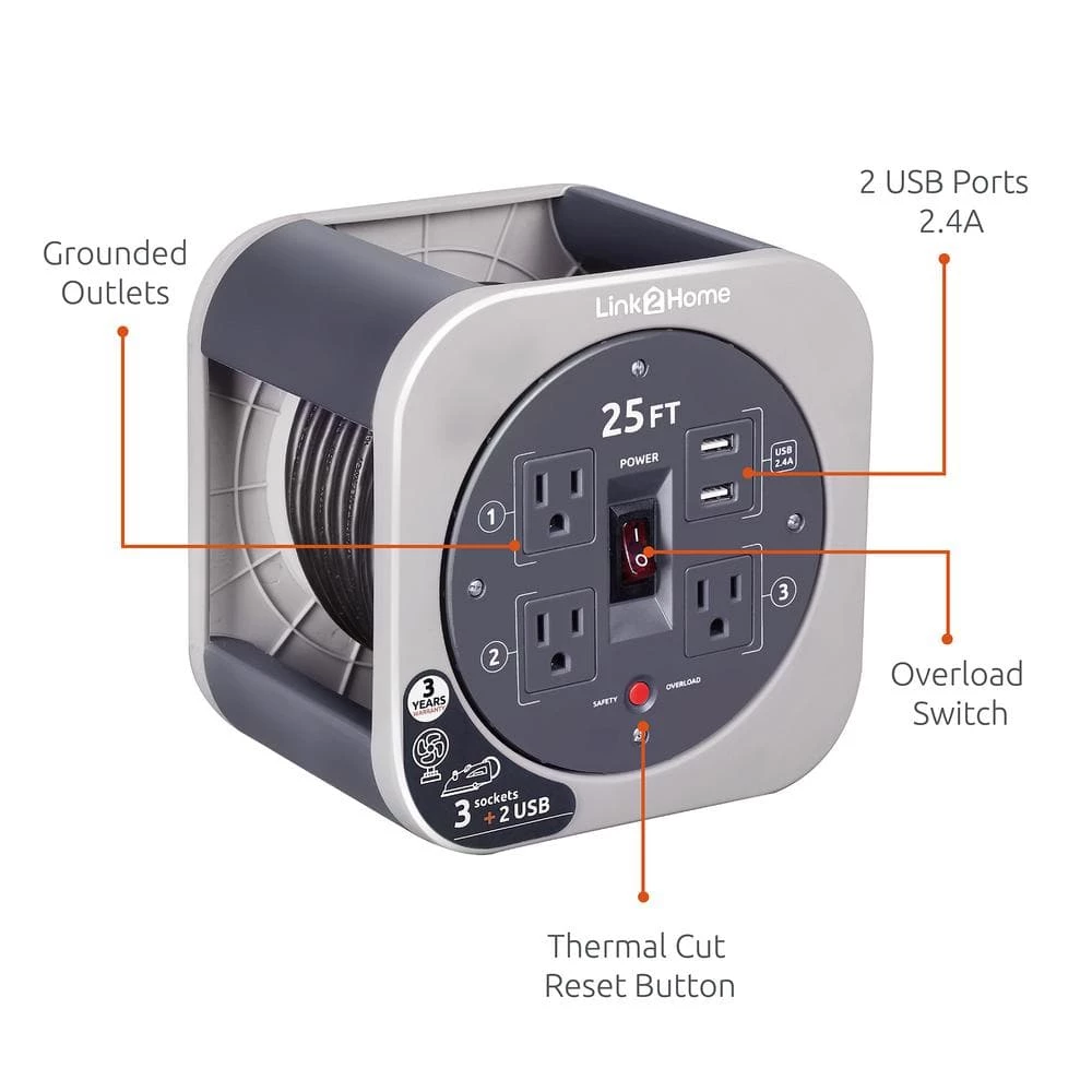 Link2Home Cord Reel 25 ft. Extension Cord 3 Power Outlets, 2 USB Ports, 2.4 Amp Fast Charge with 16 AWG SJT Cable is the perfect power solution for your home, garage, backyard, tiny spaces, urban living or office. Tangle free cord management helps cords stay organized and tidy for next use. Extension cord reel features easy grip handle for smooth rewind. Compact design enables easy storage for when not in use. Lightweight 4 handle design.