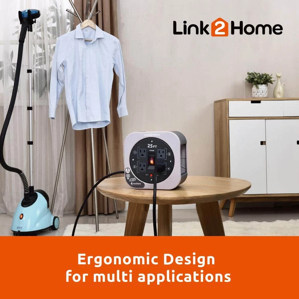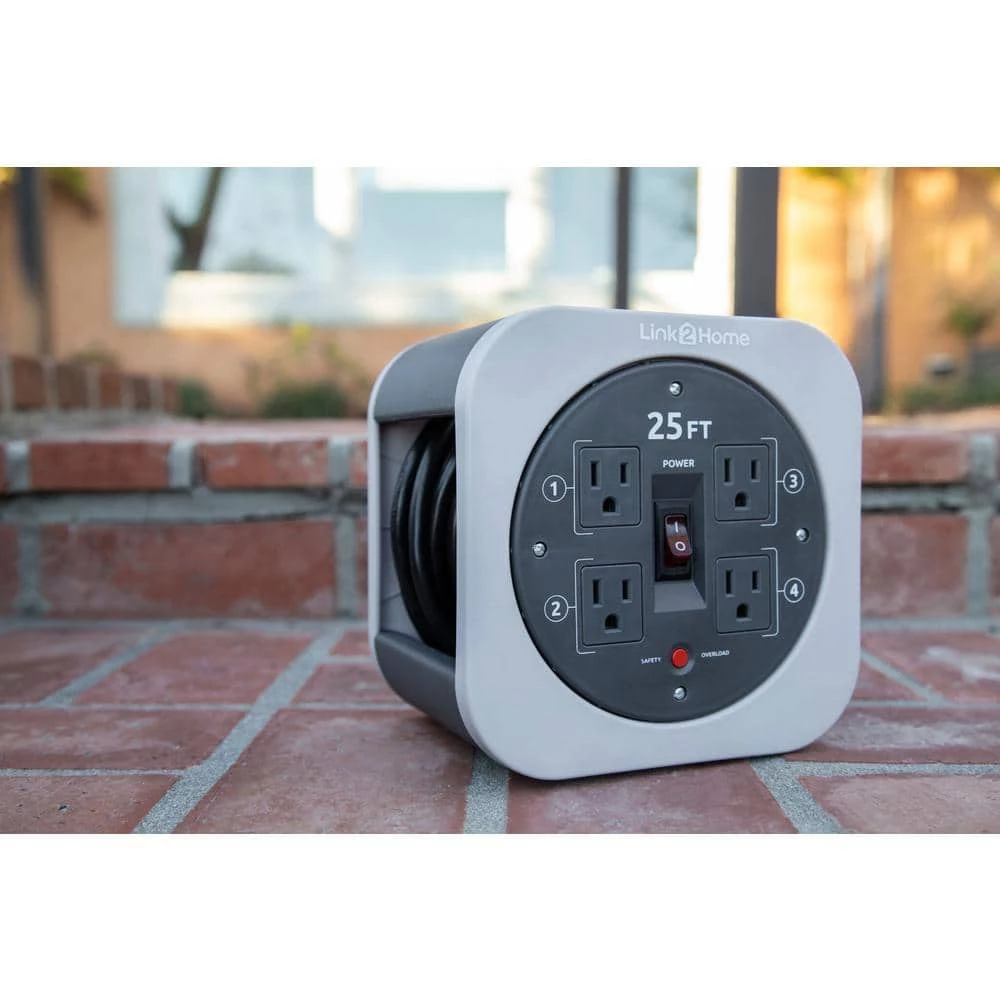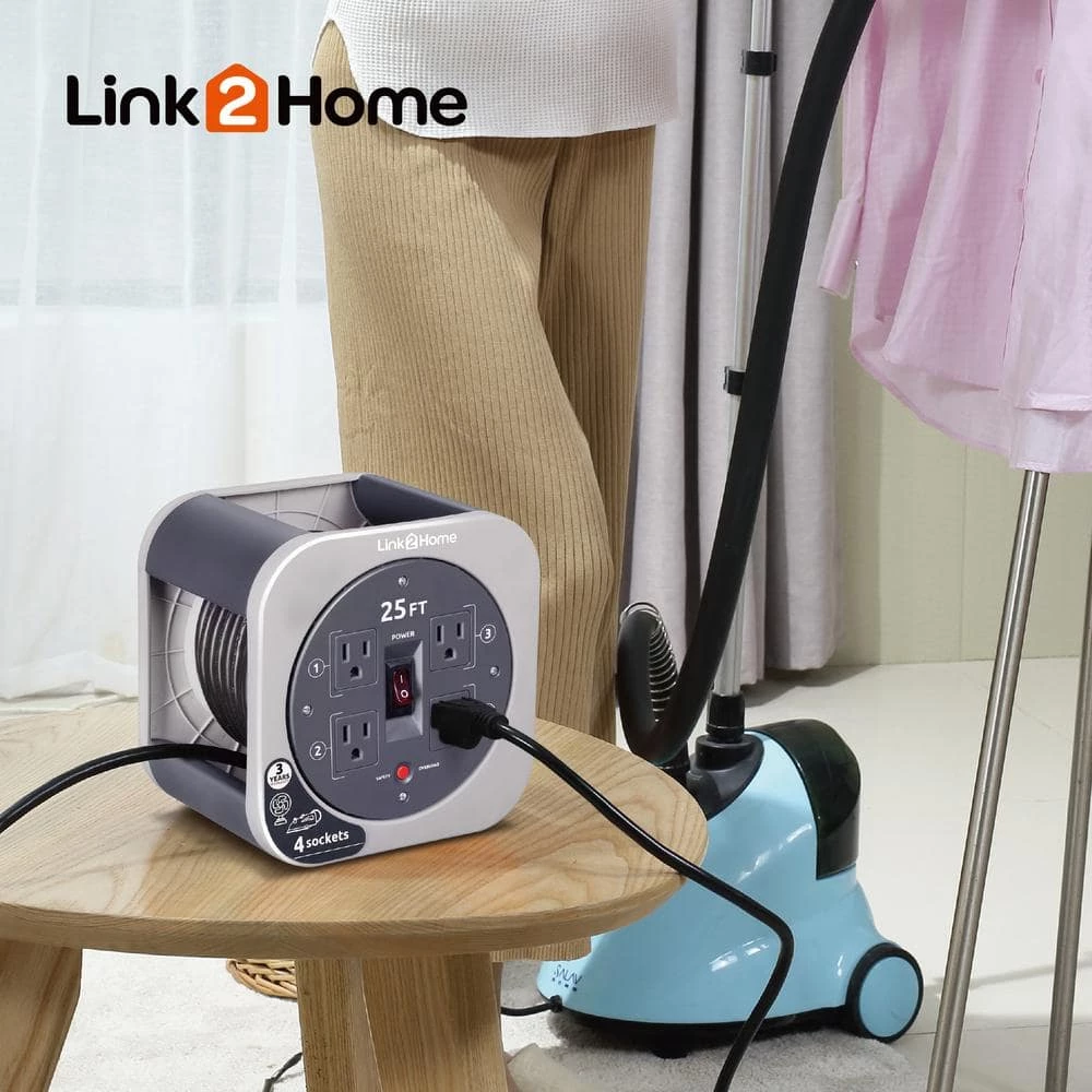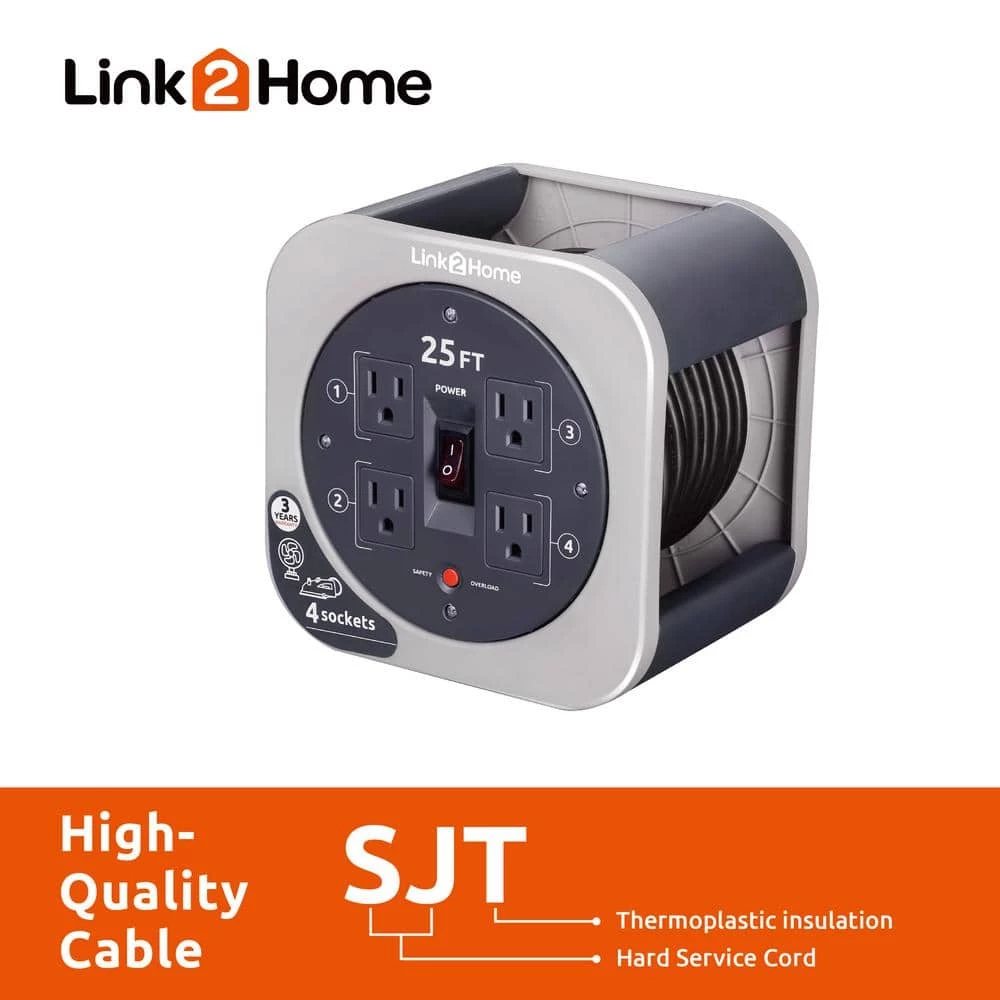 Link2Home Cord Reel 25 ft. Extension Cord 4-Power Outlets with 16 AWG SJT Cable is the perfect power solution for your home, garage, backyard, tiny spaces, urban living or office. Tangle free cord management helps cords stay organized and tidy for next use. Extension cord reel features easy grip handle for smooth rewind. Compact design enables easy storage for when not in use. Lightweight 4-handle design.