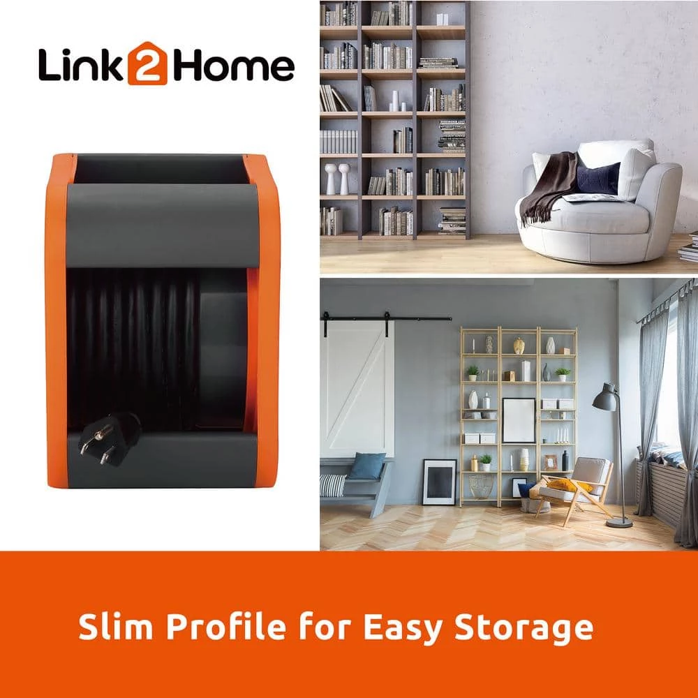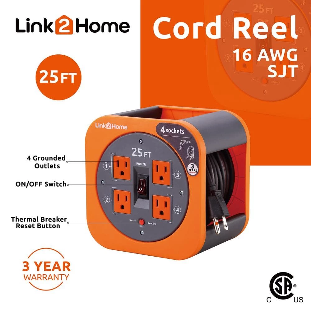 Add power to your office, backyard or garage with the Link2Home Cord Reel 25 ft. Extension Cord with 16 AWG SJTW Cable. The cords stay organized thanks to the reel with a handle for smooth rewinding. It’s also compact for easy storage when not in use, plus it has a unique four-handle design that’s also lightweight.