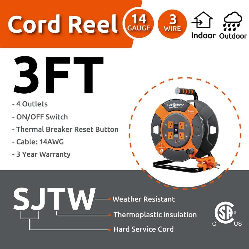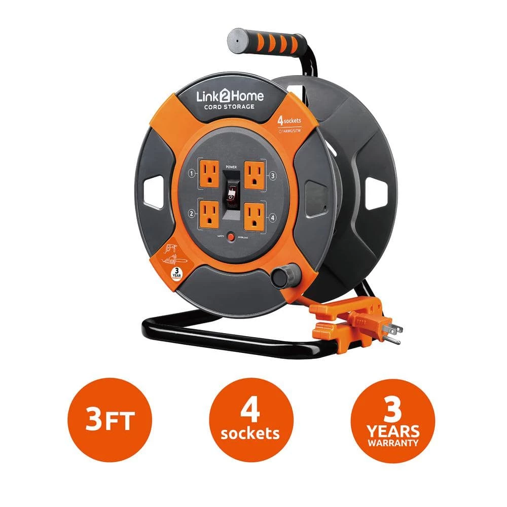 Link2Home Cord Storage 3 ft. Extension Cord 4 Power Outlets with 14 AWG SJTW Cable is the perfect power solution for your garage, backyard, warehouse space etc. Tangle free cord management helps cords stay organized and tidy for next use. Cord locking system keeps cords in place and secure. Extension cord reel features heavy duty easy grip comfort handle for smooth rewind. Durable rugged metal frame.