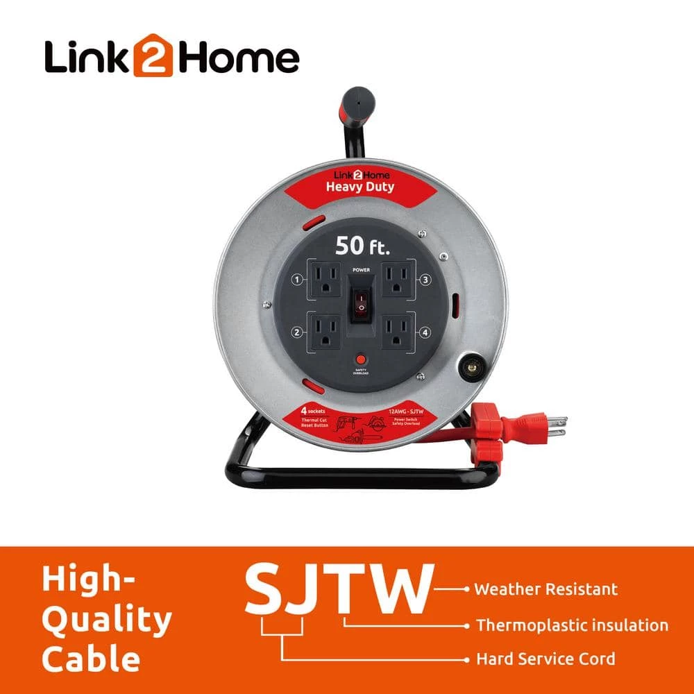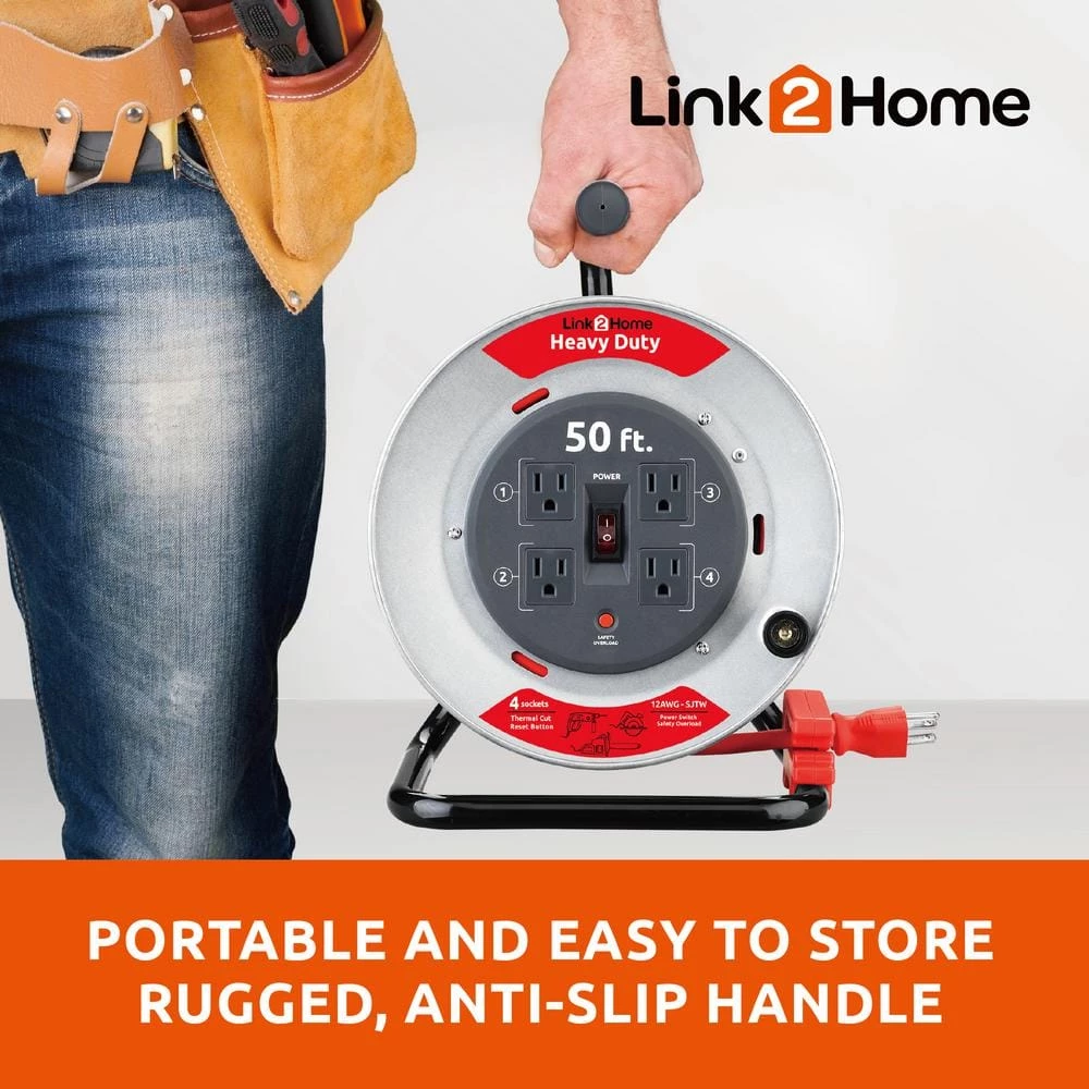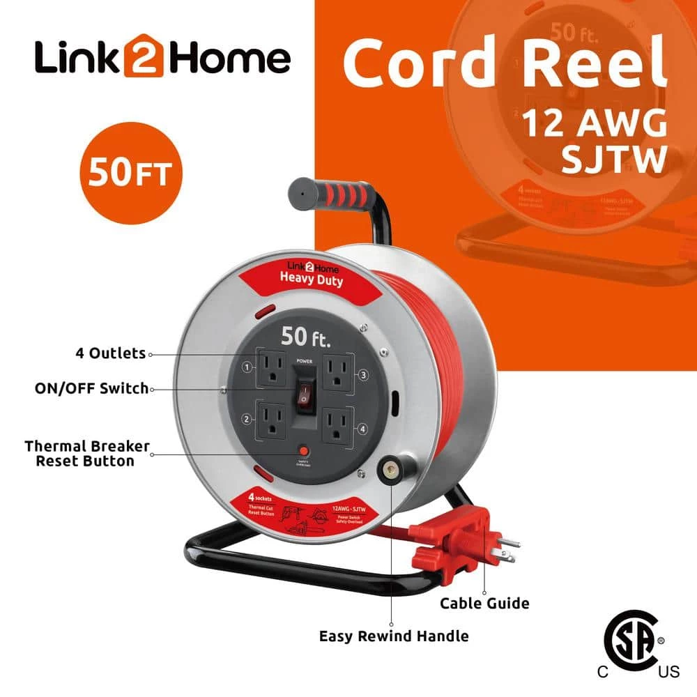 Link2Home’s PROFESSIONAL GRADE metal cord reel brings innovation, power and convenience closer to you while you are hard at work. This cord reel features a highly visible 50 ft. 12 AWG SJTW Extension Cord and 4 Grounded Power Outlets making it the perfect power solution for working around the home, construction site, garage workspace and more. Tangle free cord management helps cords stay organized and tidy for next use. Cord locking system keeps cords in place and secure. Extension cord reel features easy grip comfort handles for smooth rewind. Durable rugged metal frame and drum.