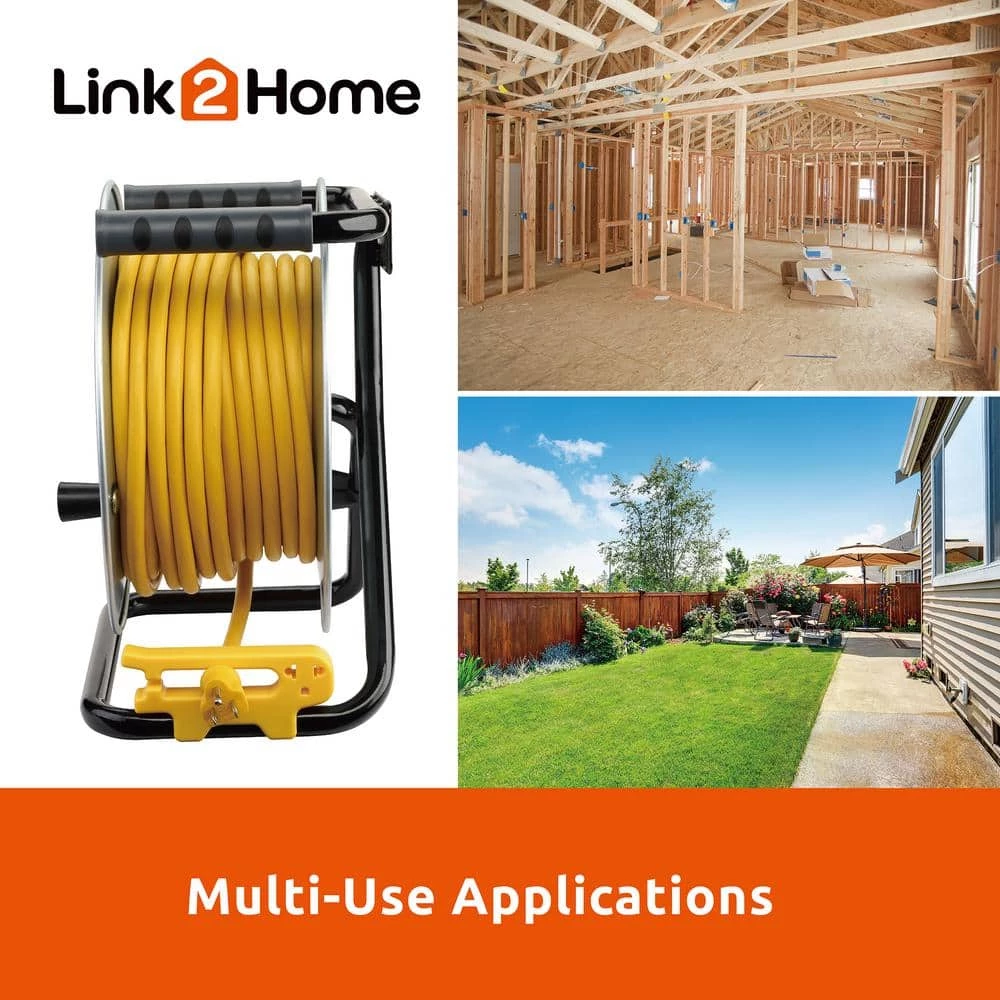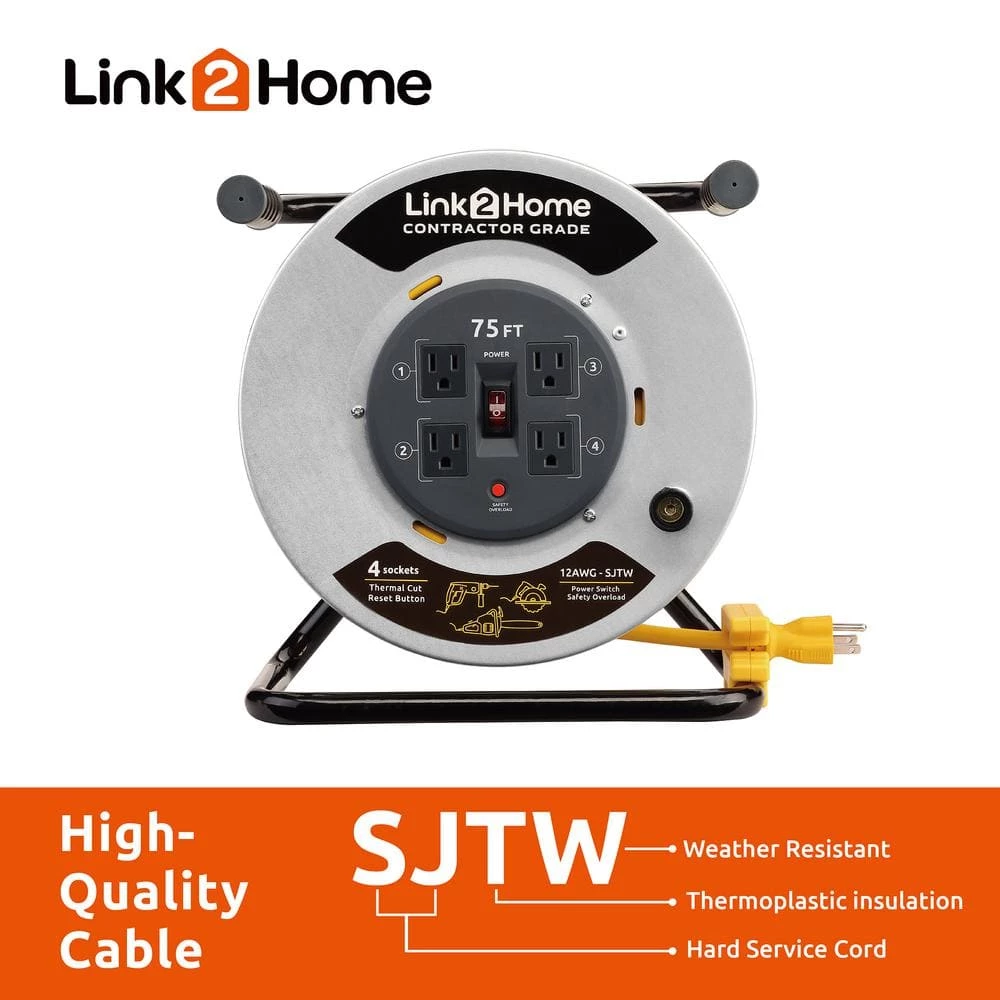 Link2Home CONTRACTOR GRADE metal cord Reel 75 ft. Extension Cord 4 Power Outlets with 12 AWG SJTW Cable is the perfect power solution for construction side, backyard, warehouse space etc. Tangle free cord management helps cords stay organized and tidy for next use. Cord locking system keeps cords in place and secure. Extension cord reel features heavy-duty double easy grip comfort handles for smooth rewind. Durable rugged metal frame and drum. Heavy-duty high visibility outdoor extension cord.